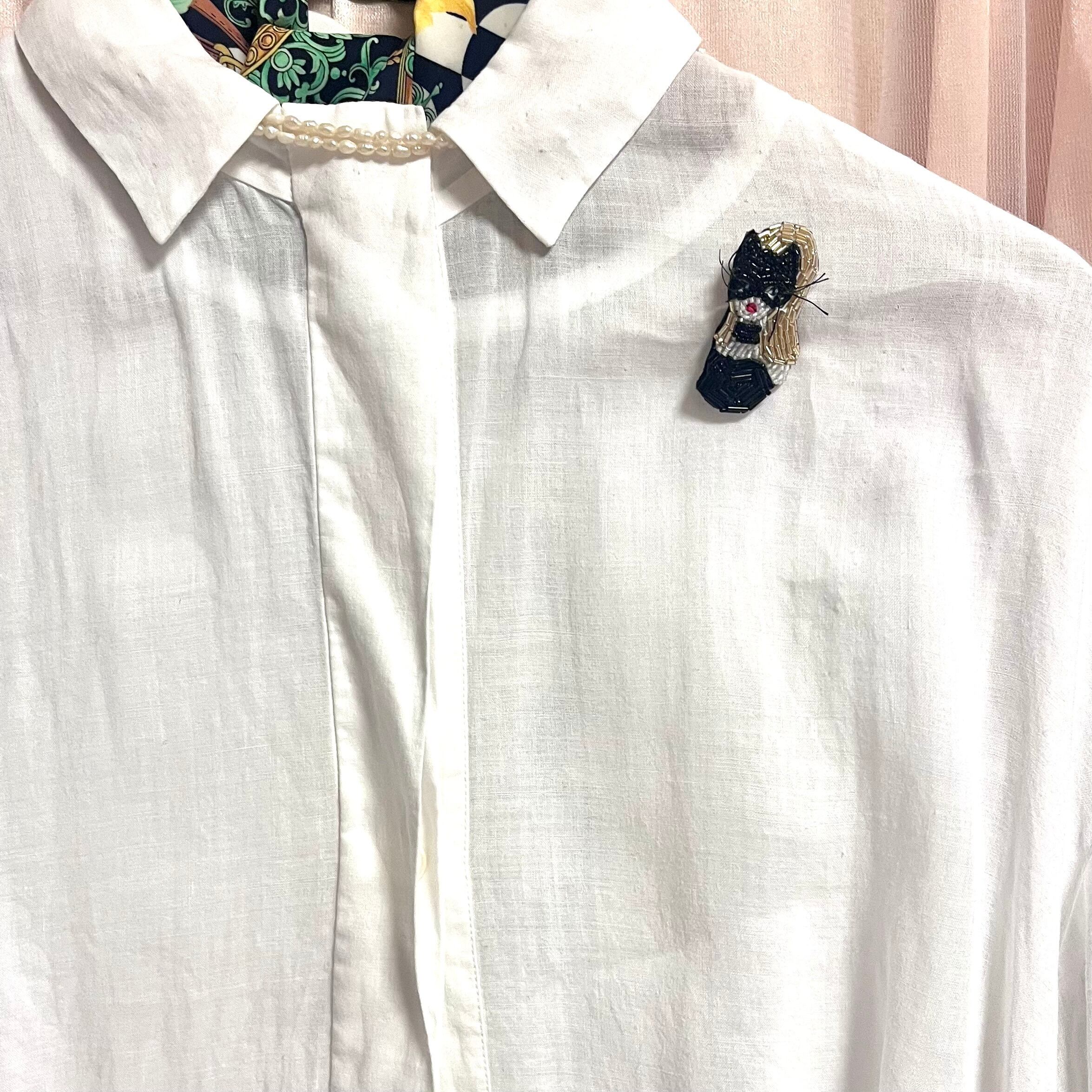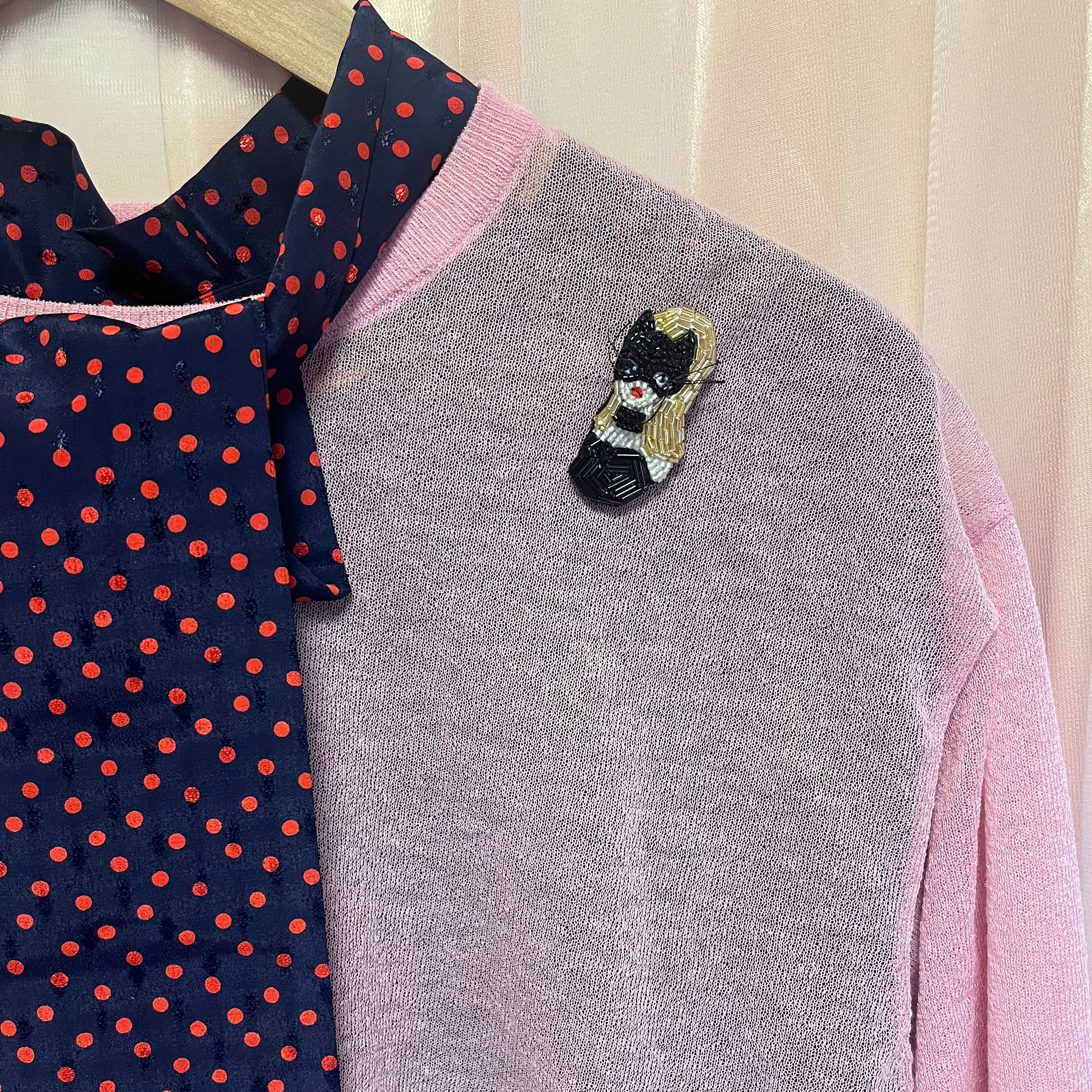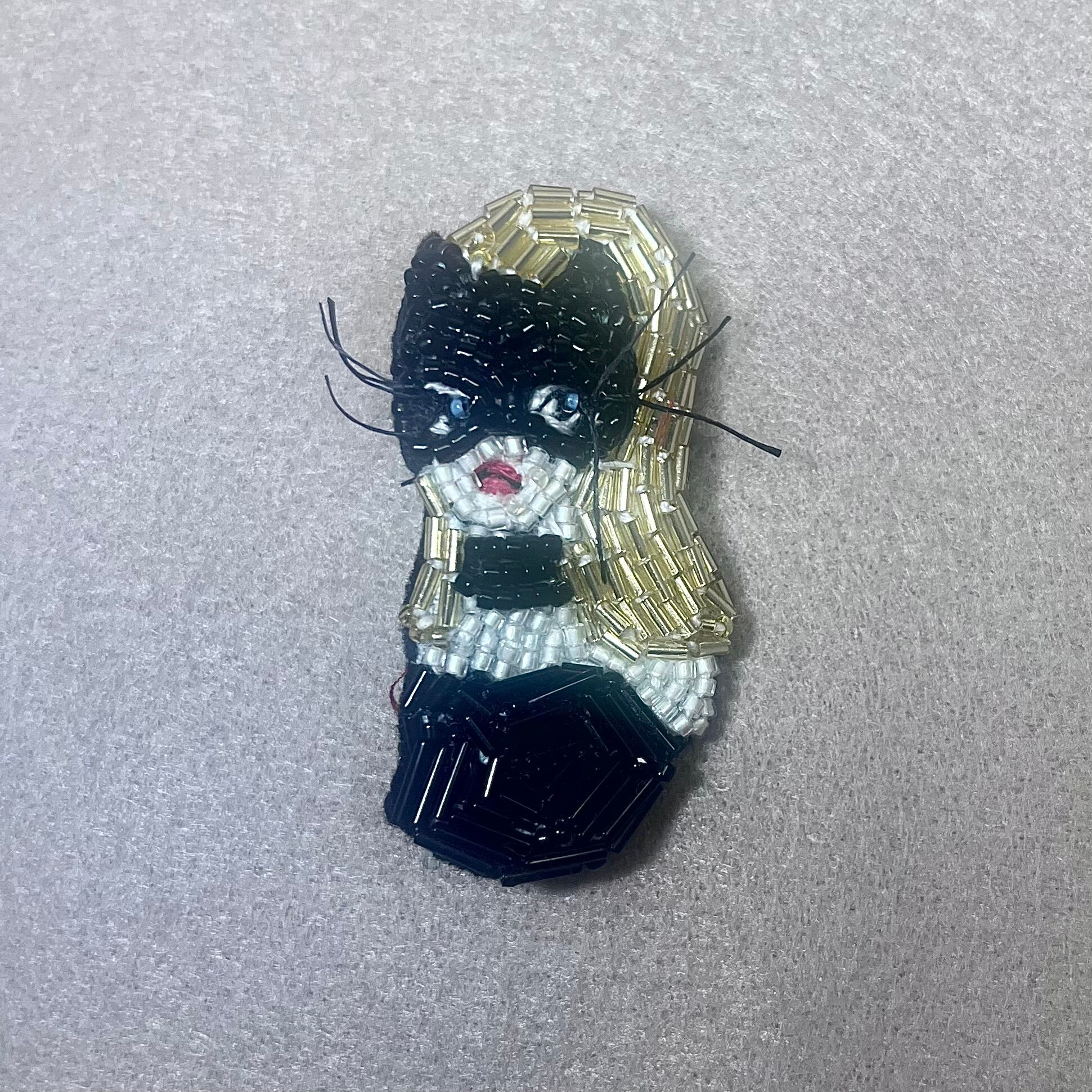 繊細なビーズ刺繍で表現したネコマスクデザインのビーズブローチです。