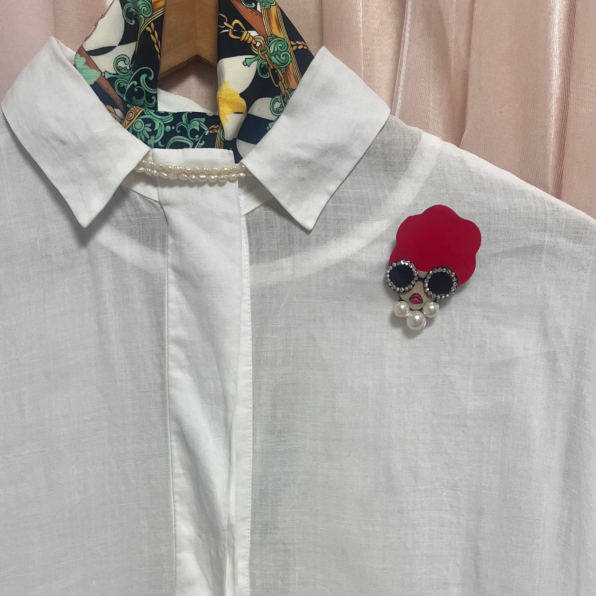 シンプルな服にもブローチひとつでインパクトある装いに。