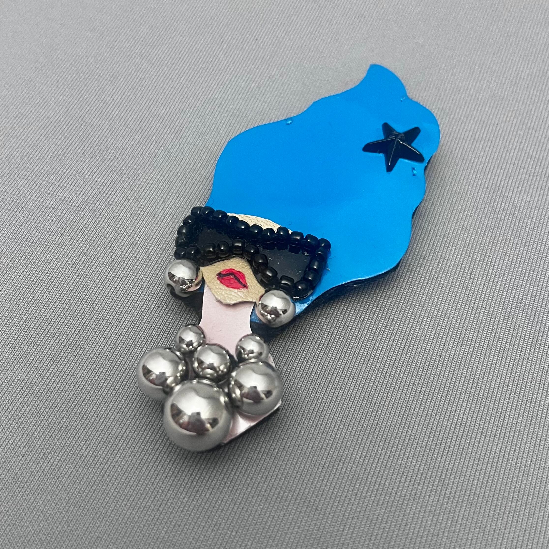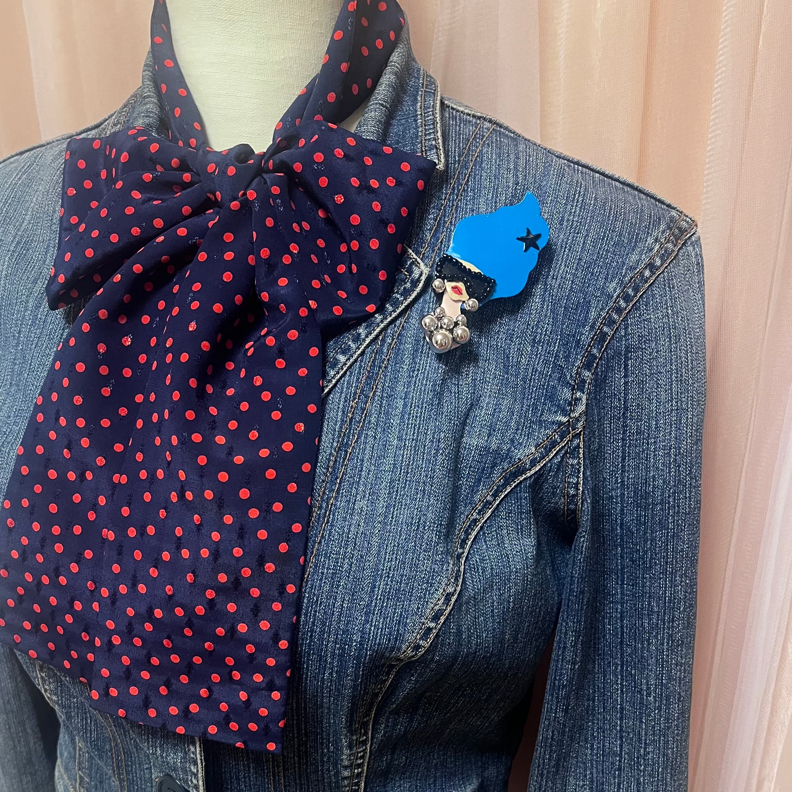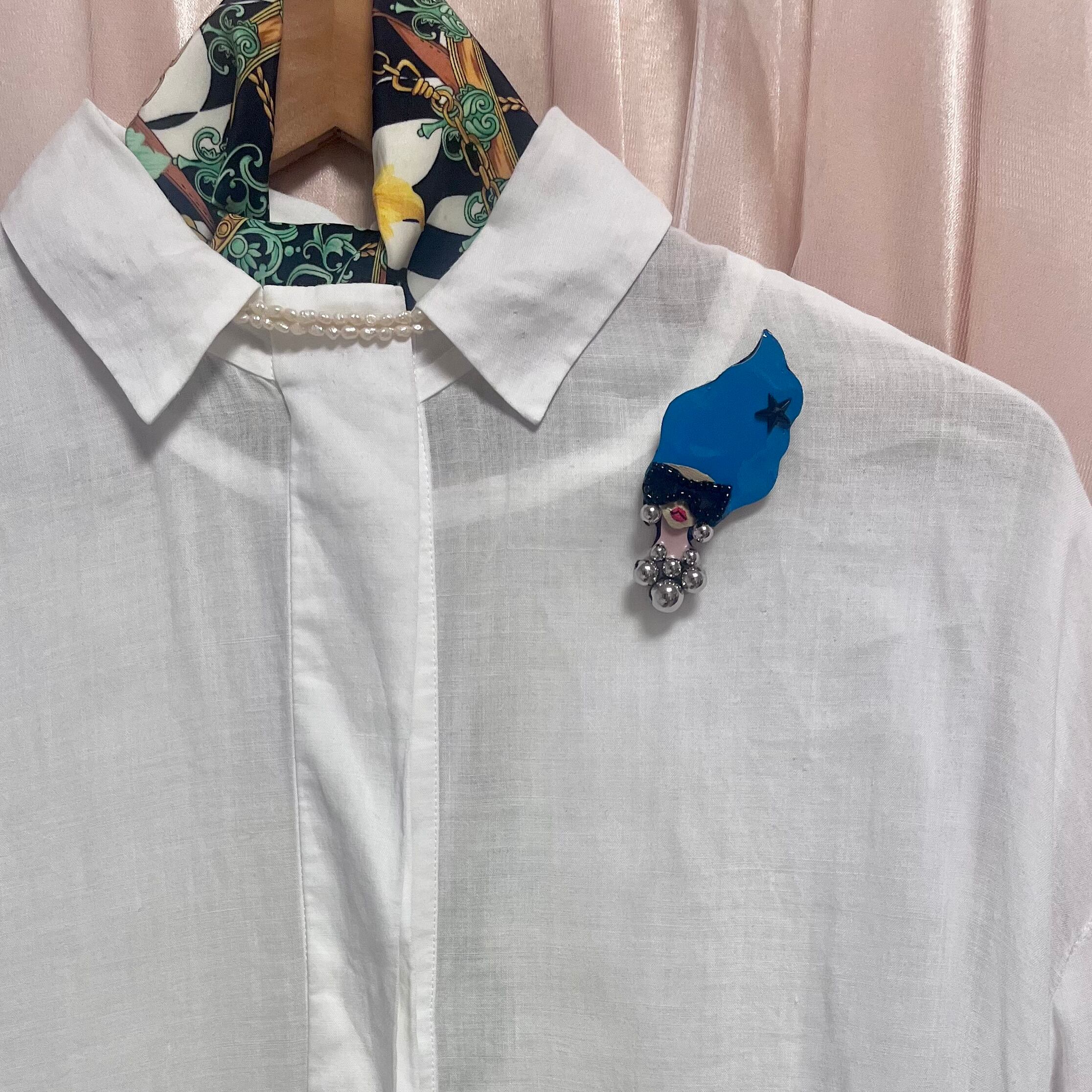 シンプルな服にもブローチひとつでインパクトある装いに。