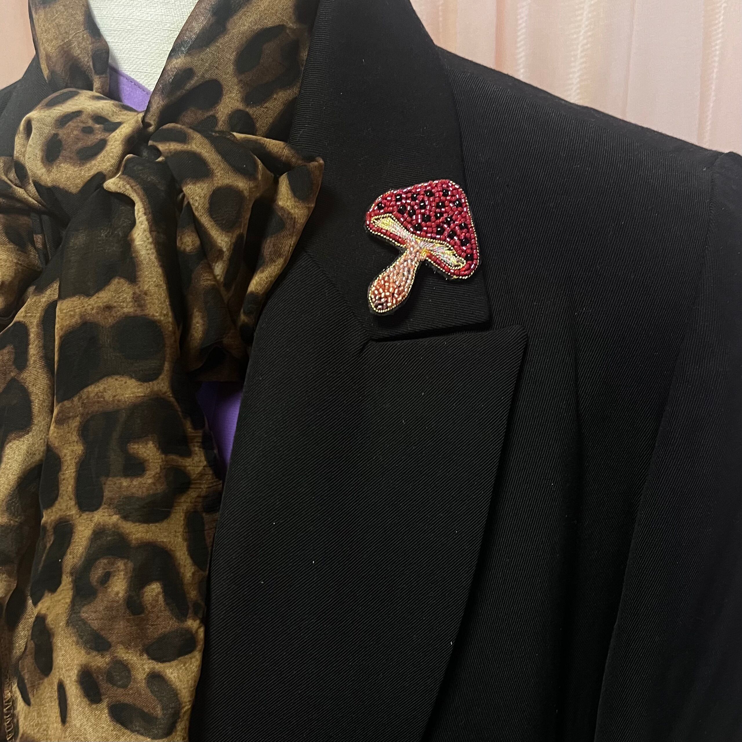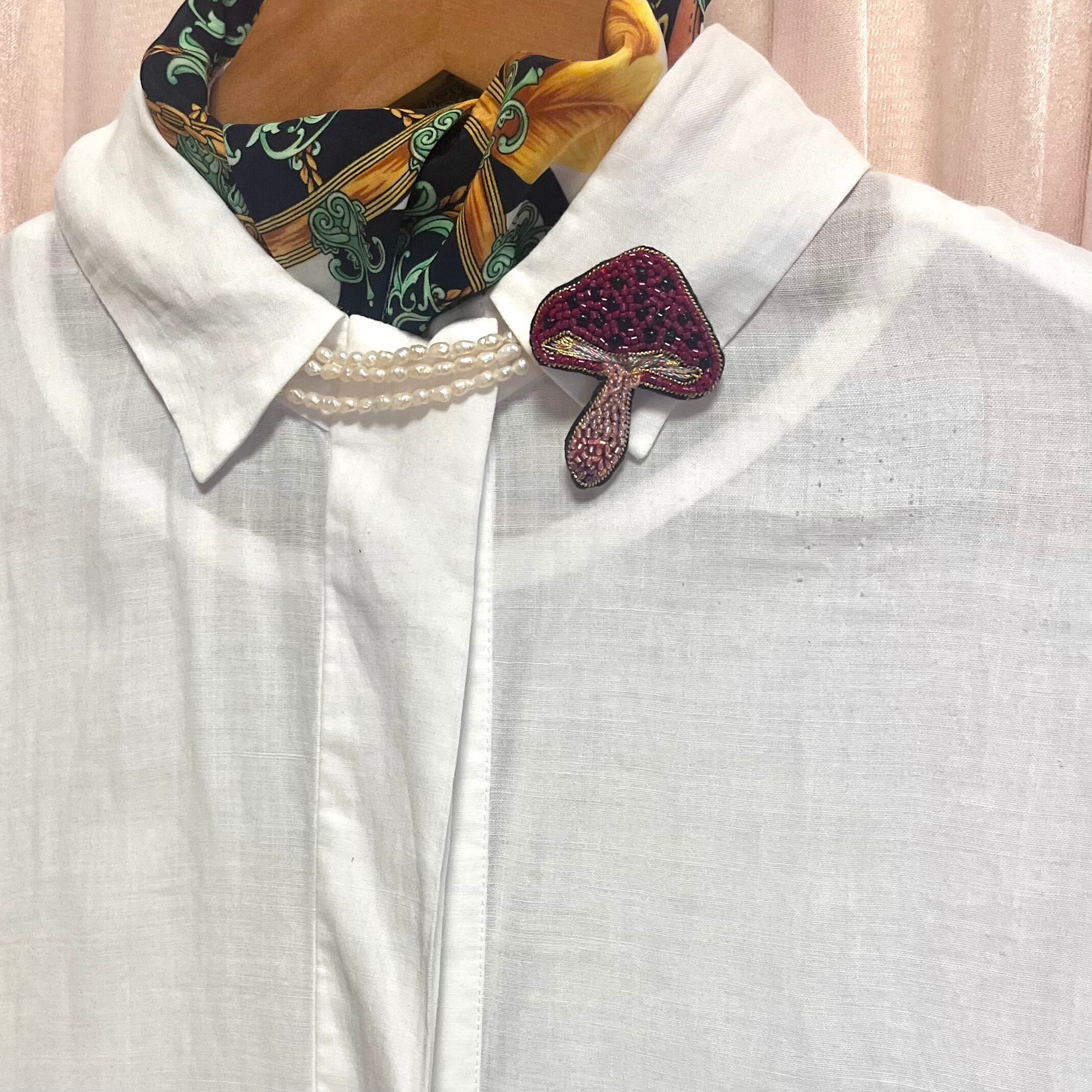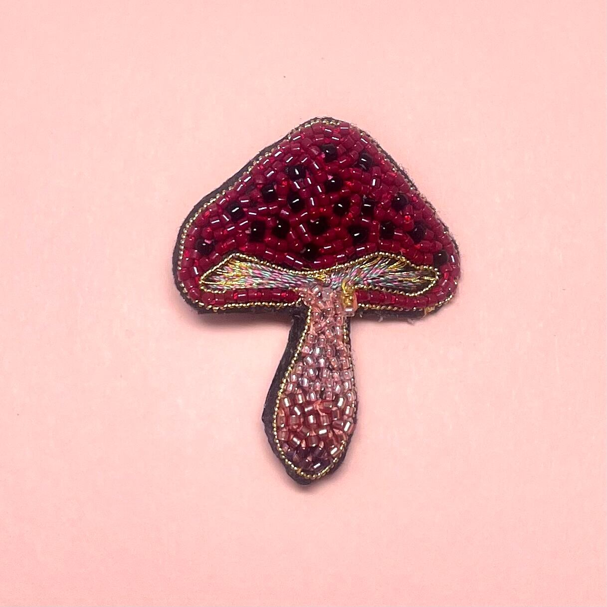 繊細なビーズ刺繍で表現したきのこモチーフのブローチ。