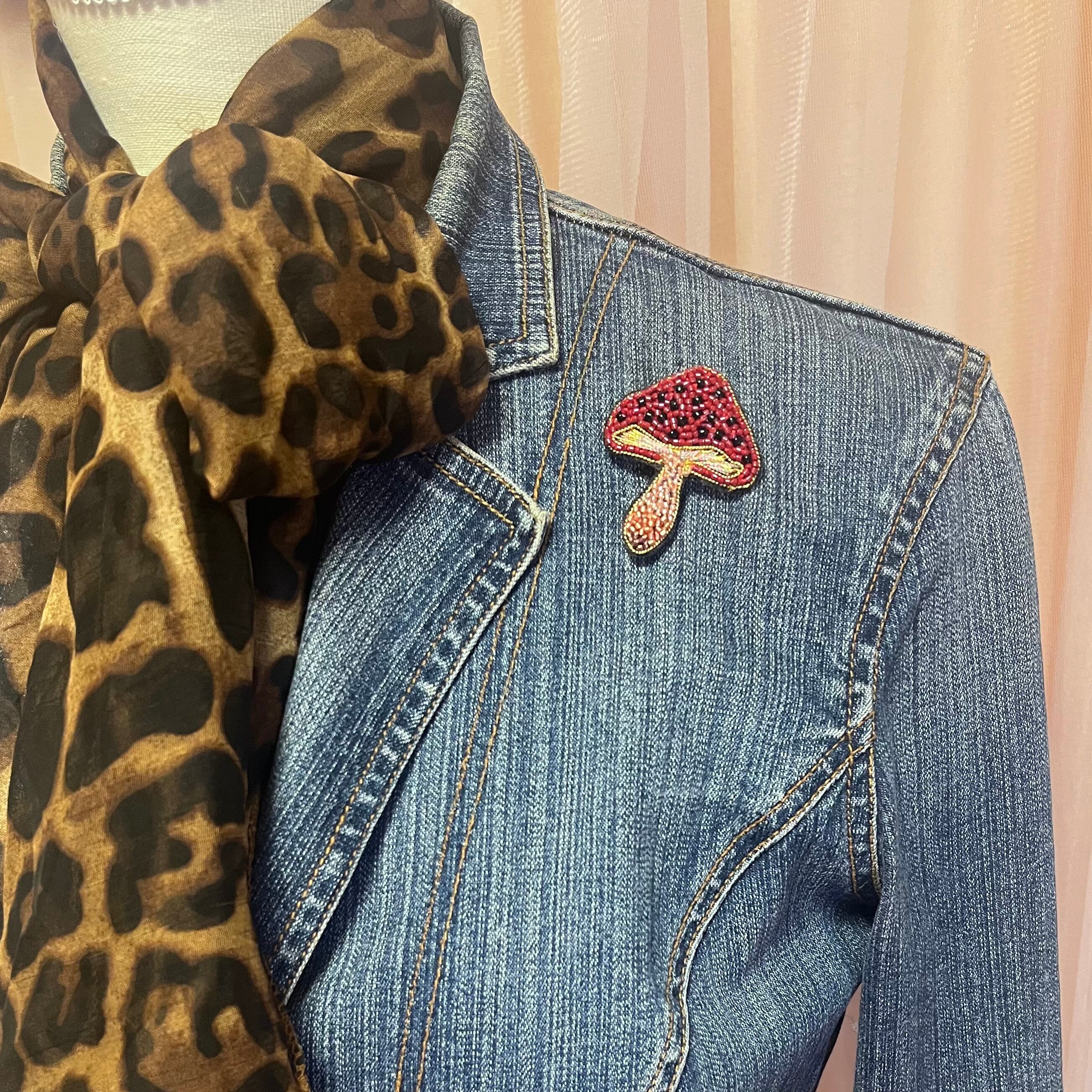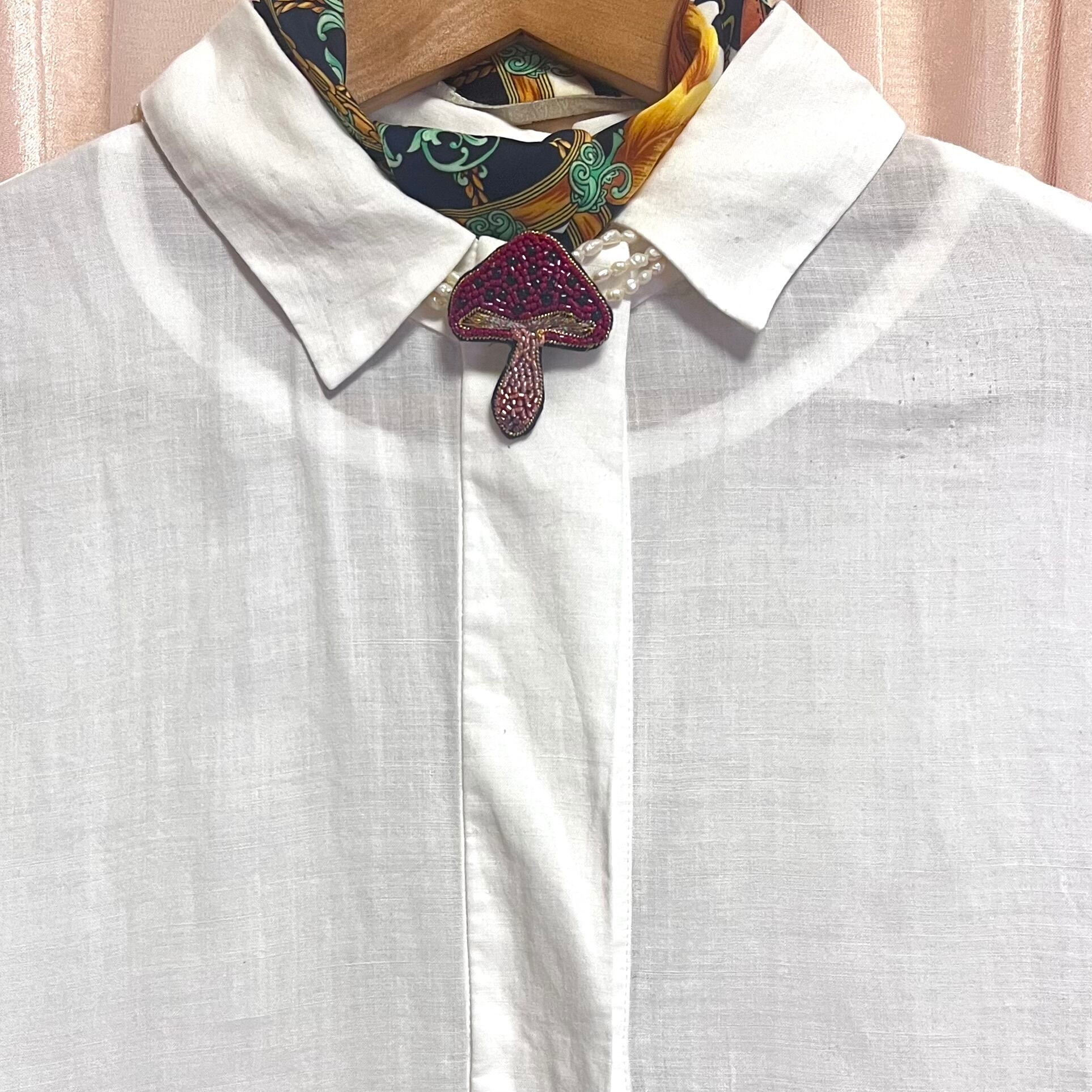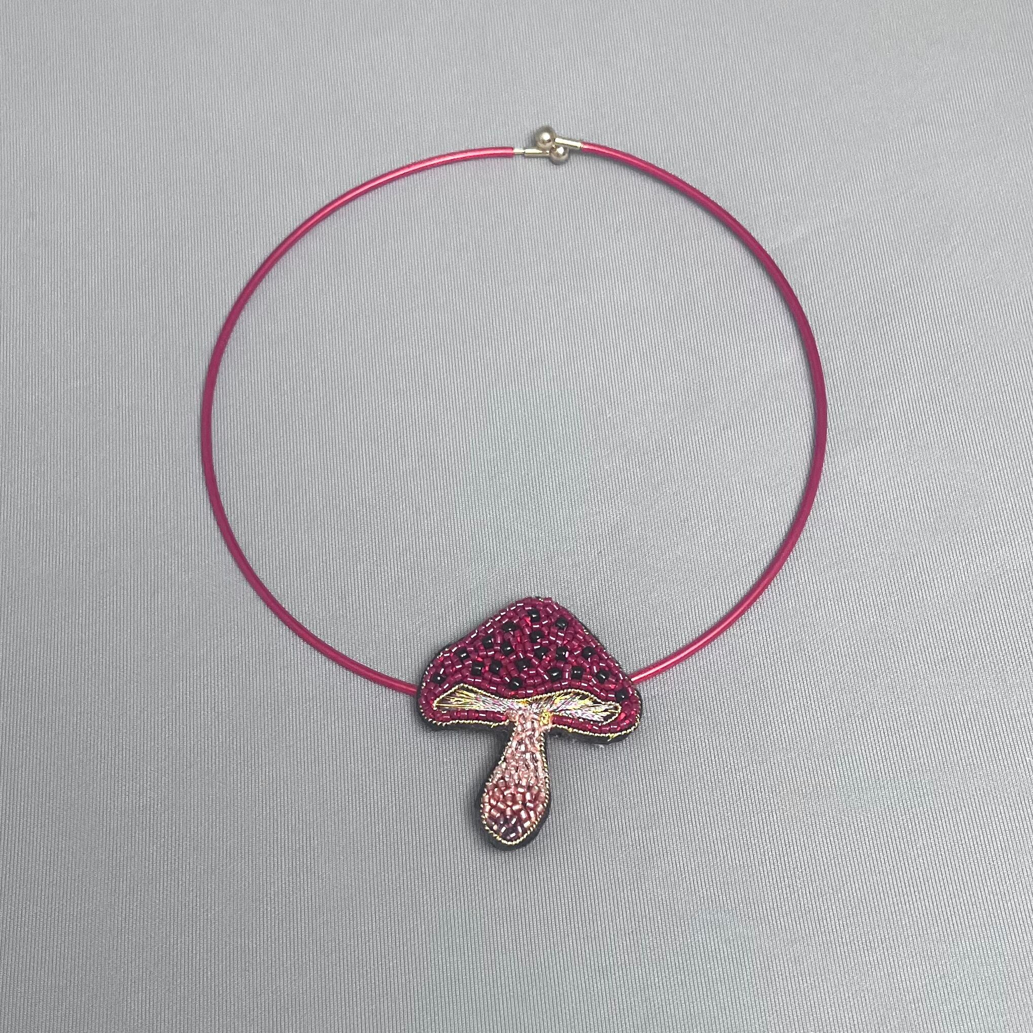 繊細なビーズ刺繍で表現したきのこモチーフのブローチ。