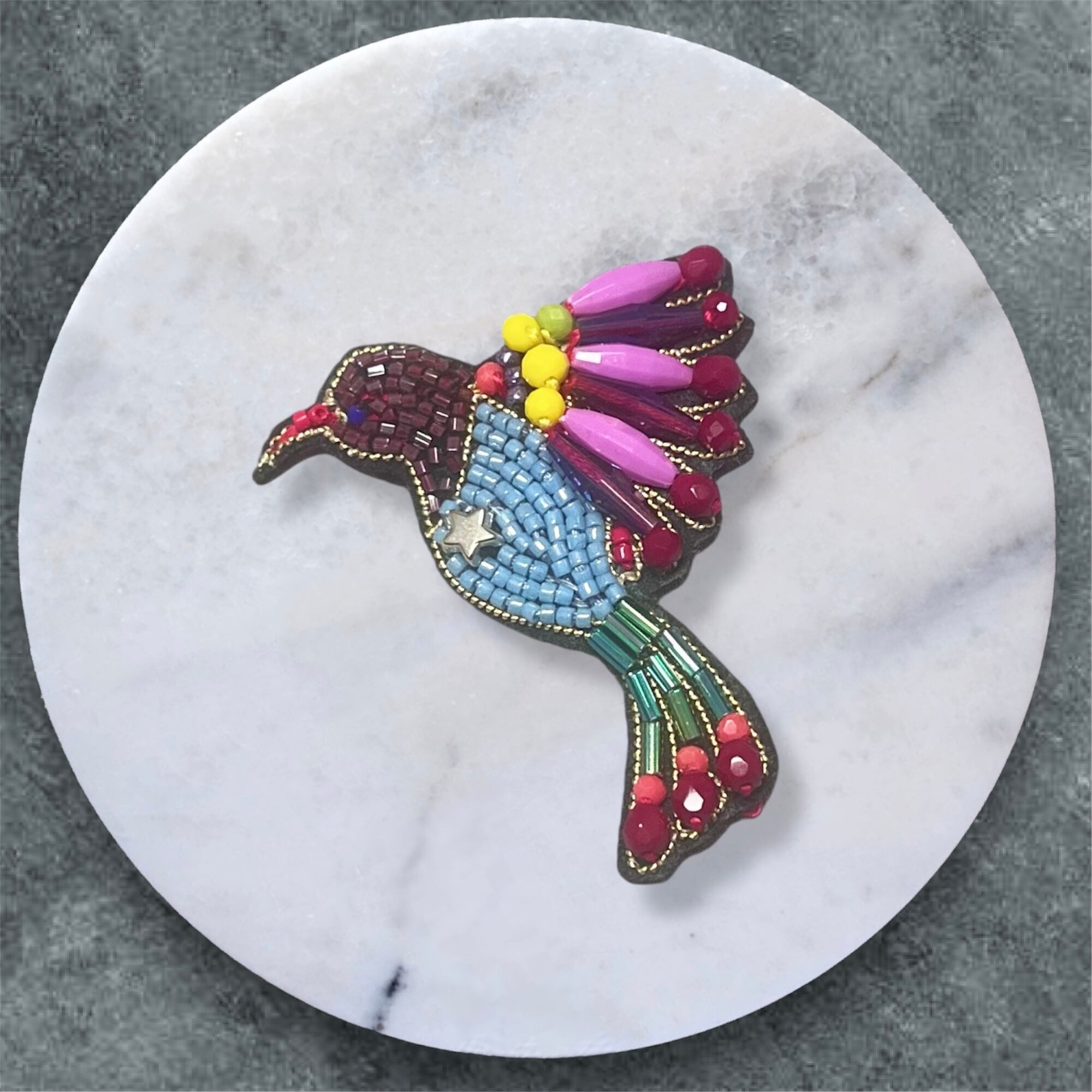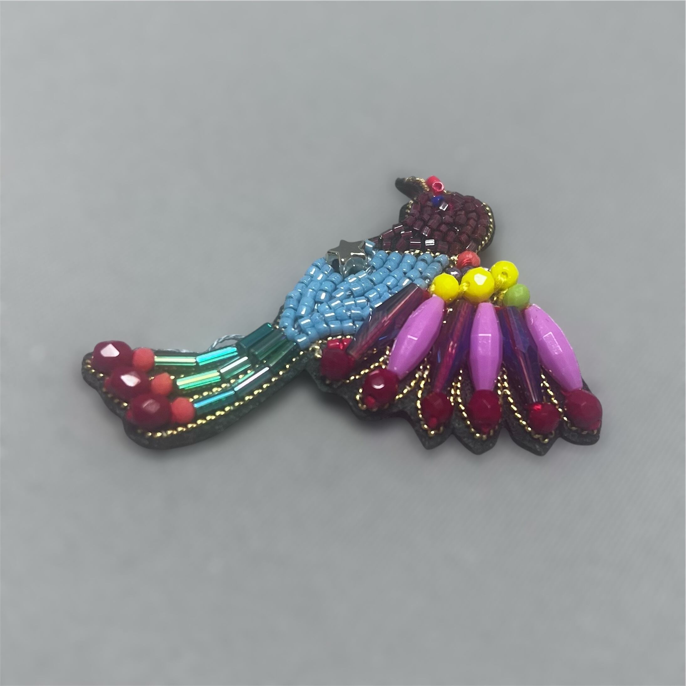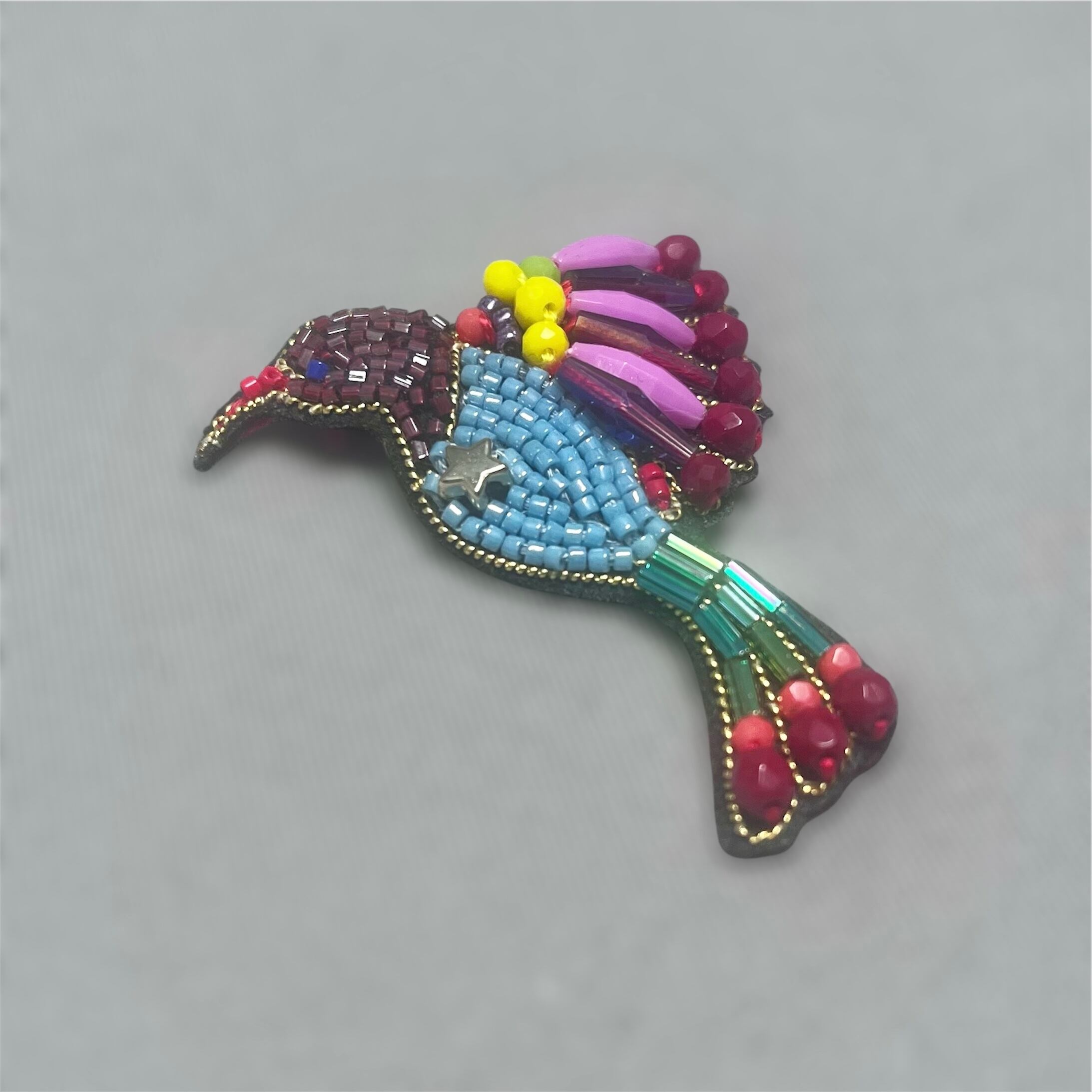 色とりどりのビーズ刺繍で仕上げた、鳥モチーフのブローチ。