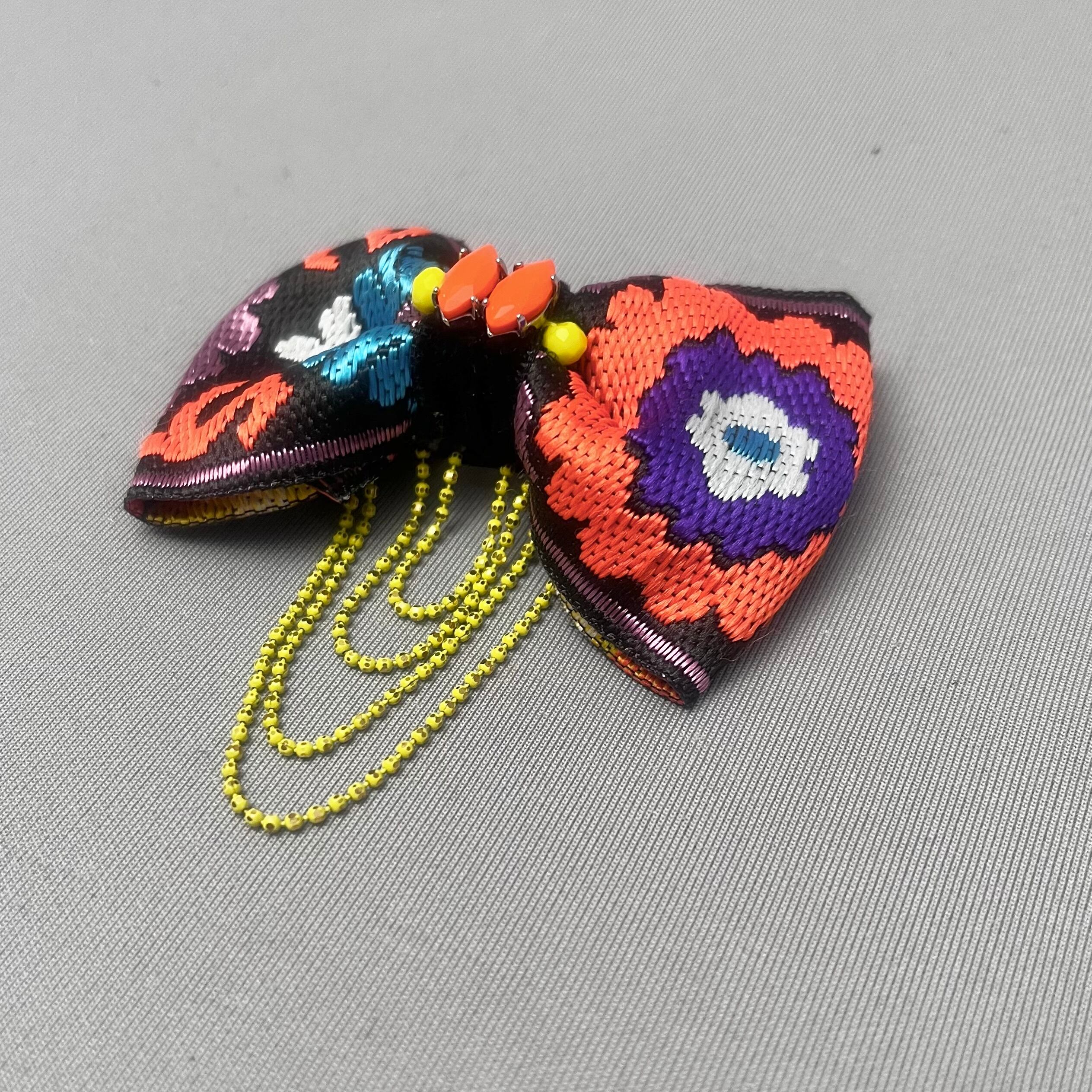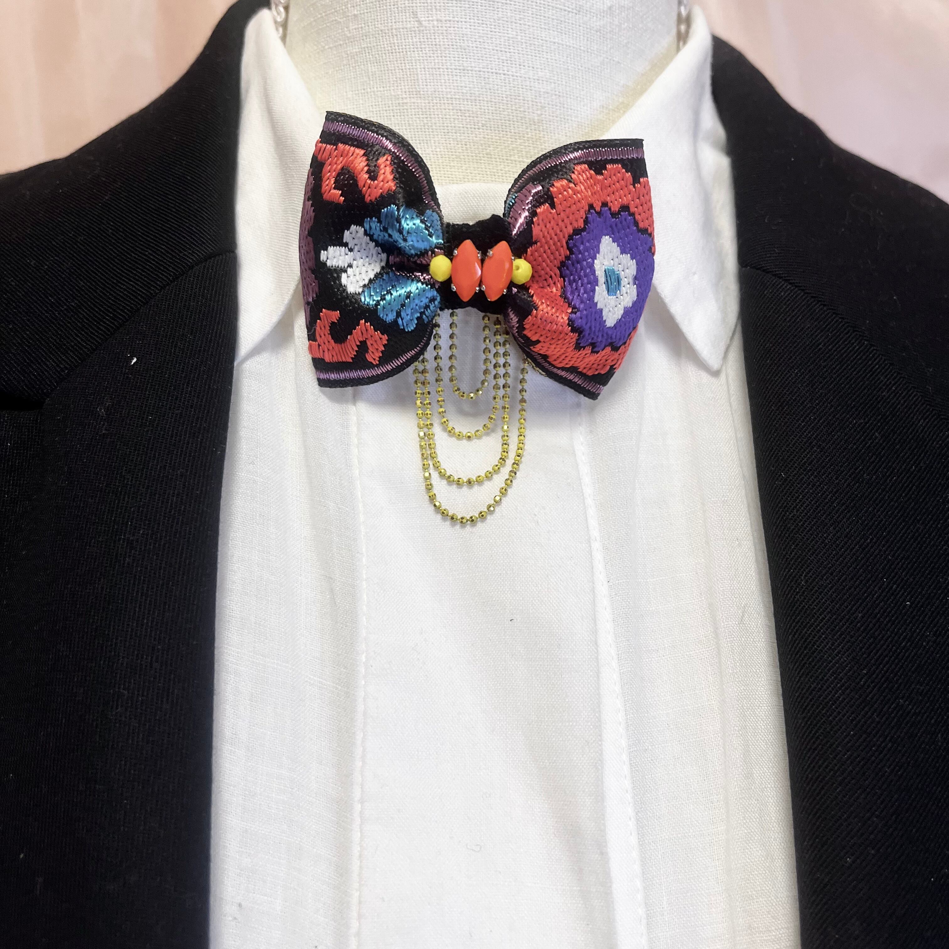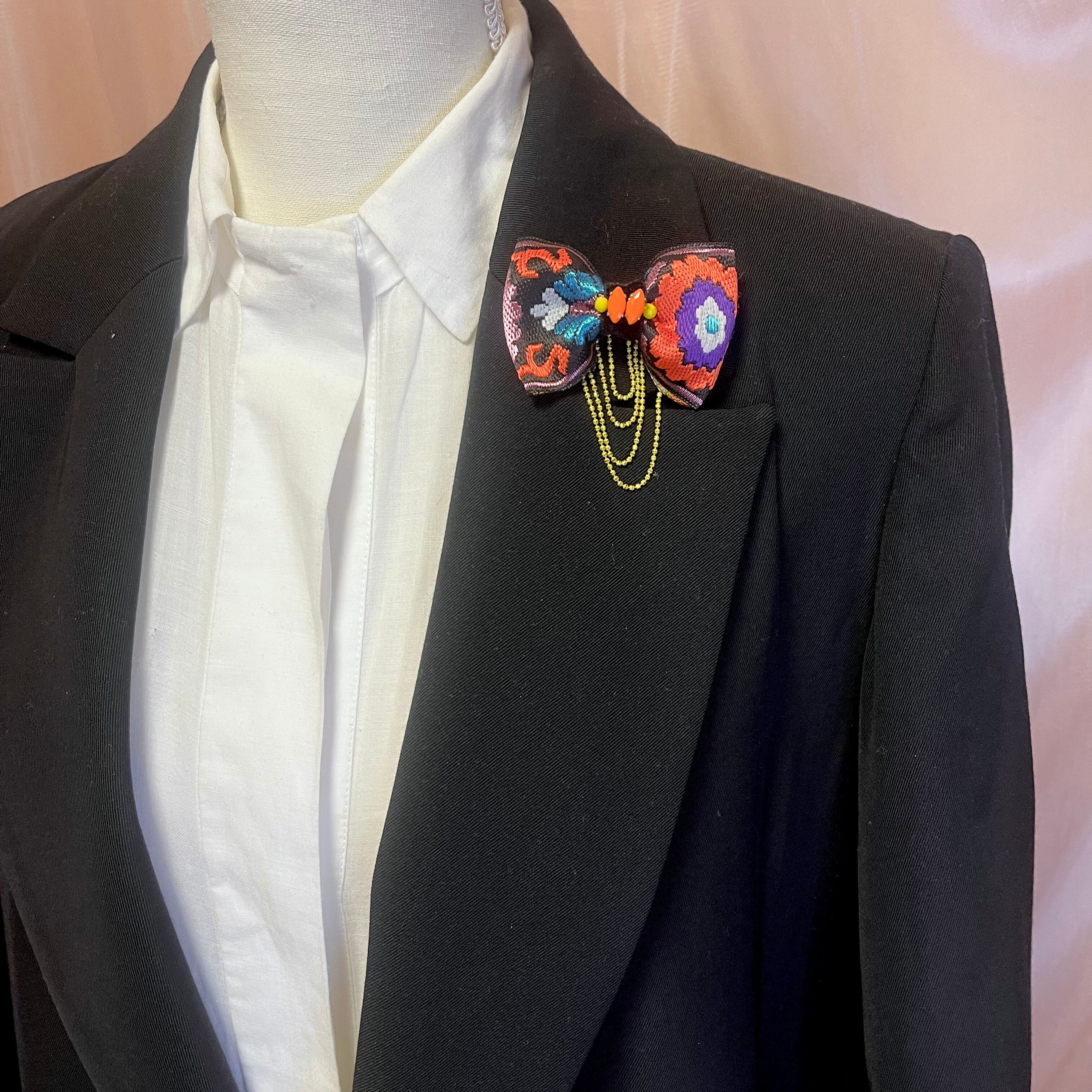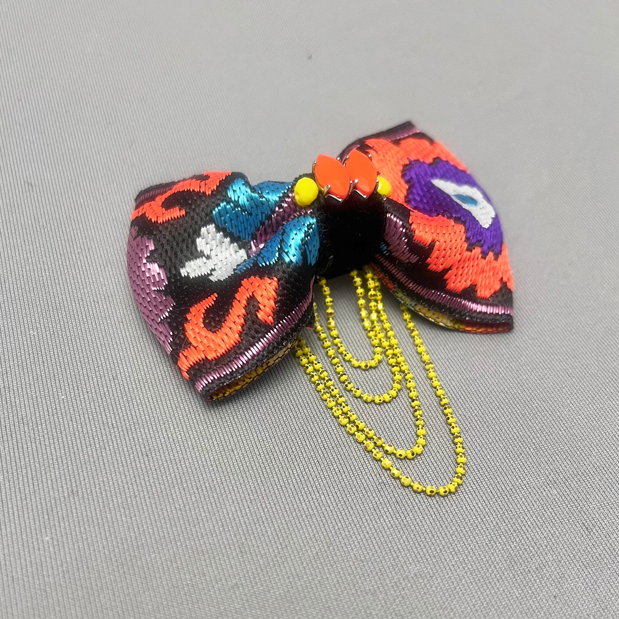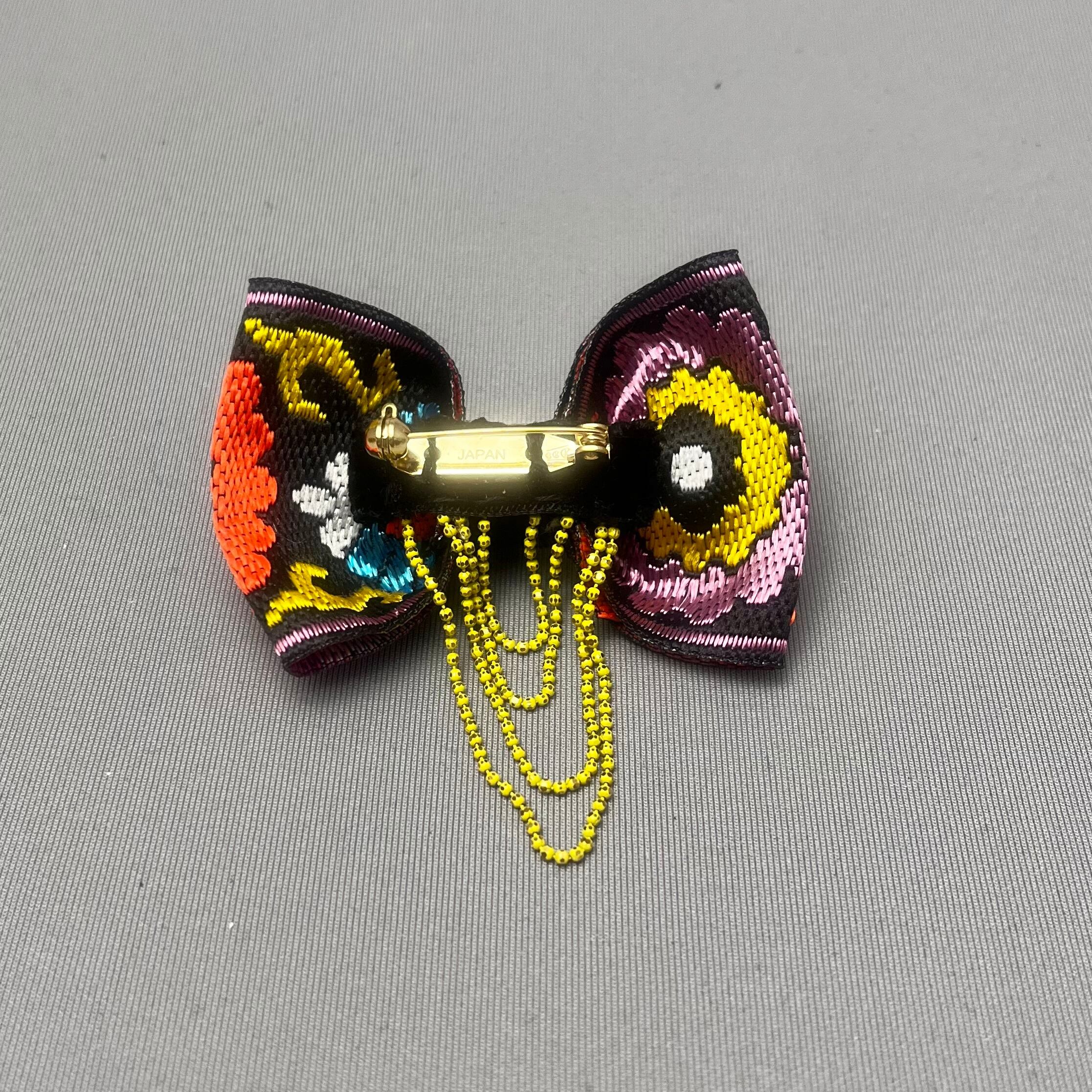 カラフルなリボンを使用し、独特のデザインと鮮やかな色彩が魅力のブローチです。ポップカラーのチェーンが軽やかに揺れ動き、シンプルなコーディネートに華やかさをプラスしてくれる特別なアイテムです。