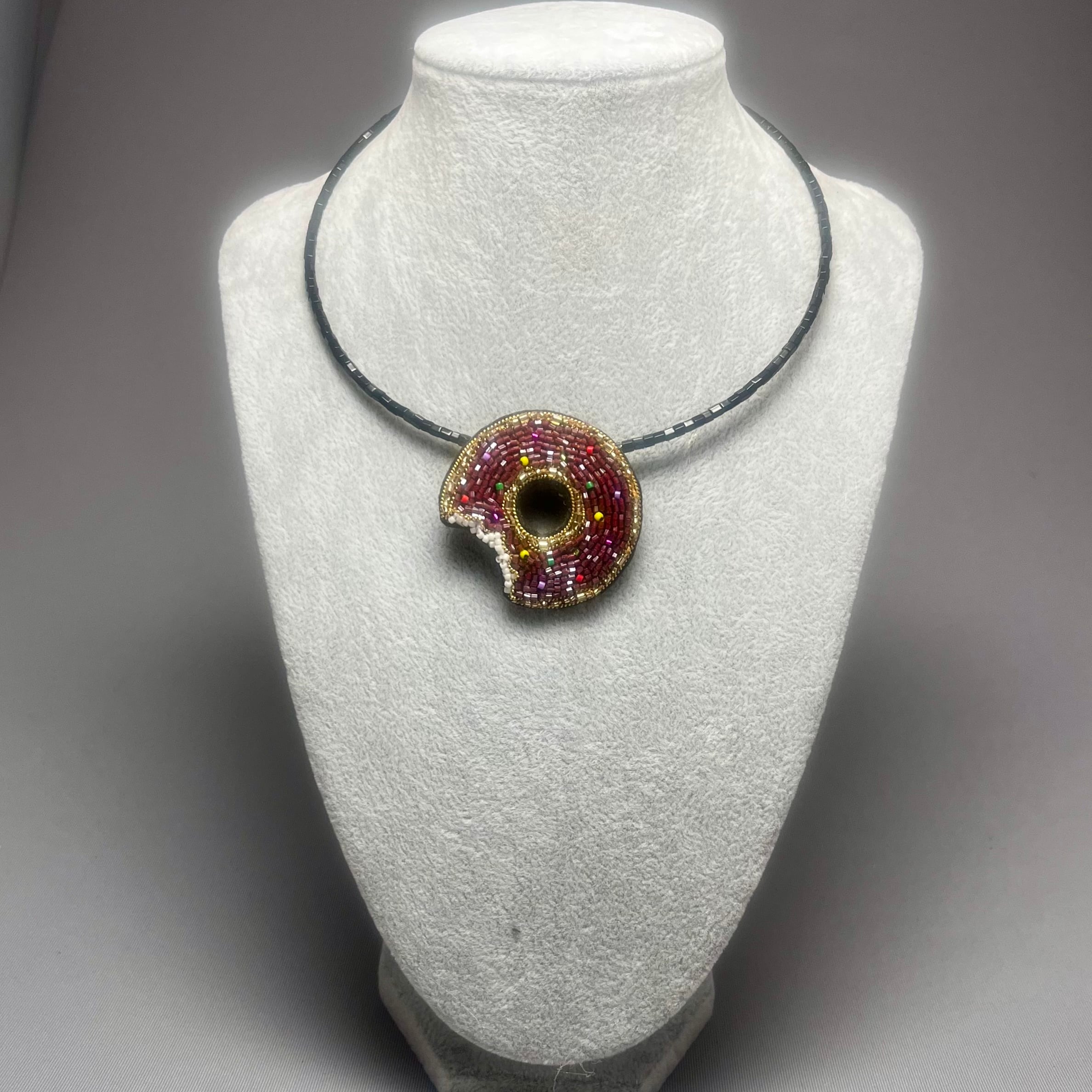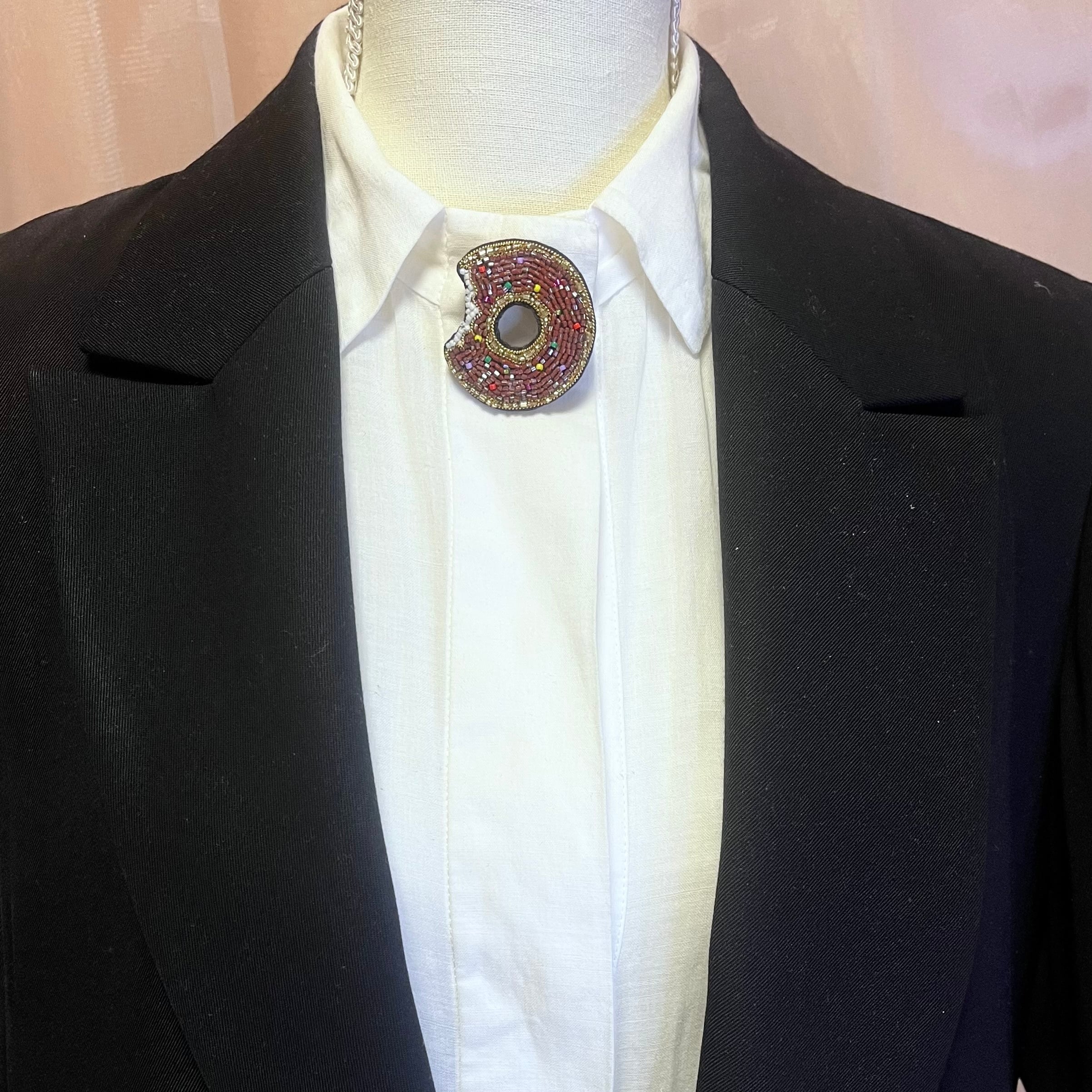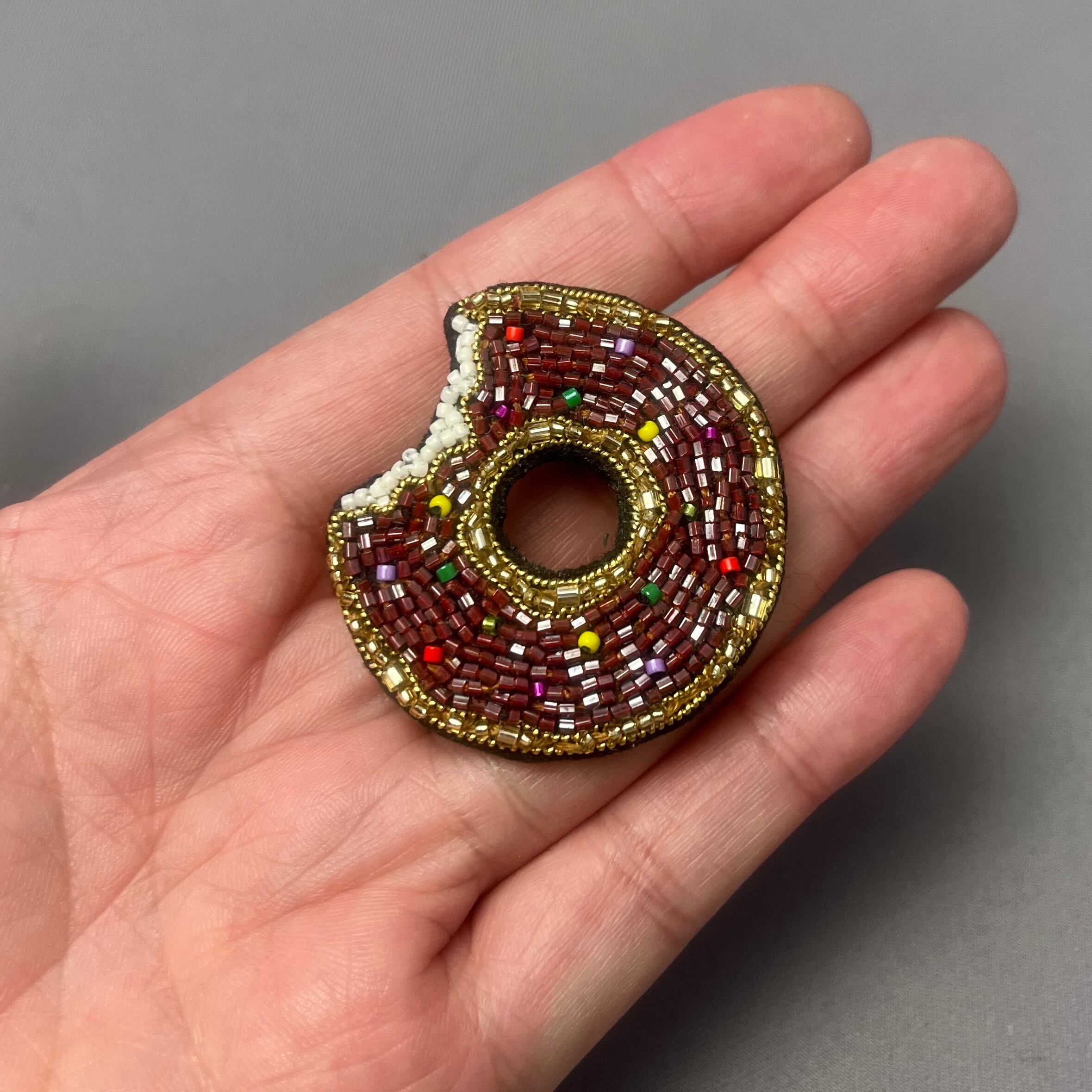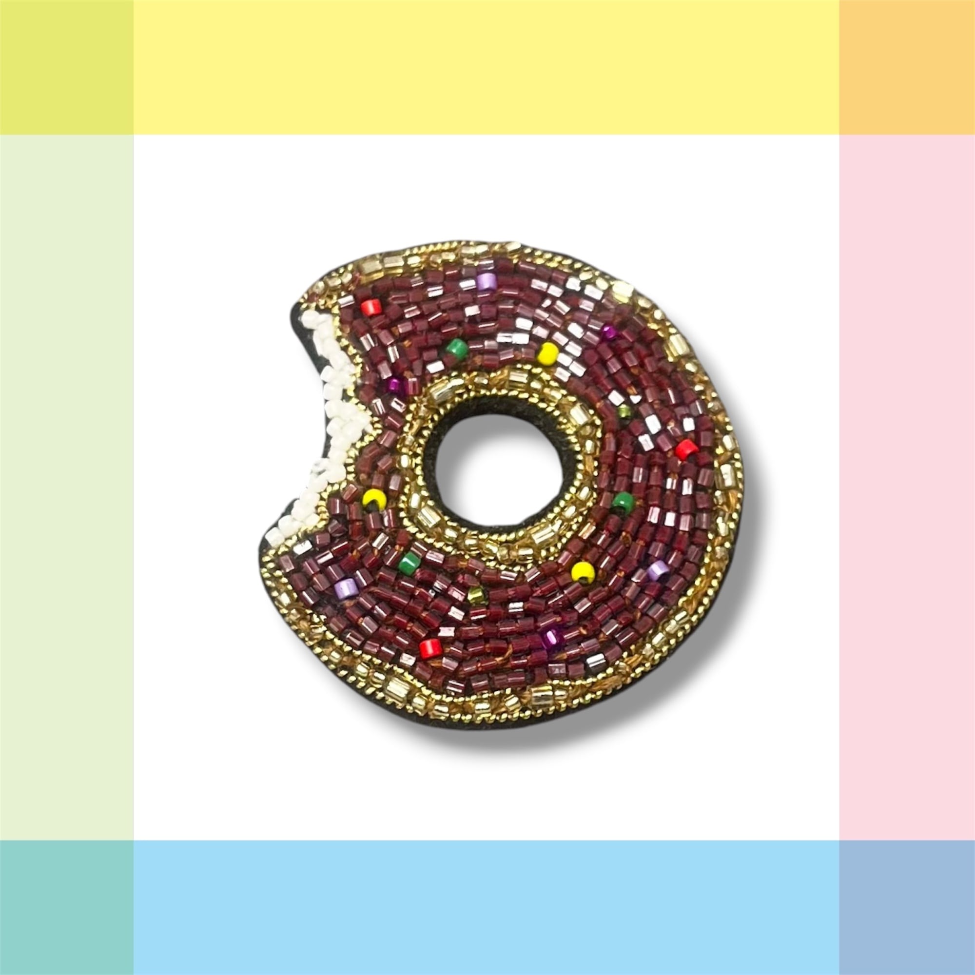 カラフルなビーズが施されたドーナツブローチは、見た目にも楽しいデザインです。