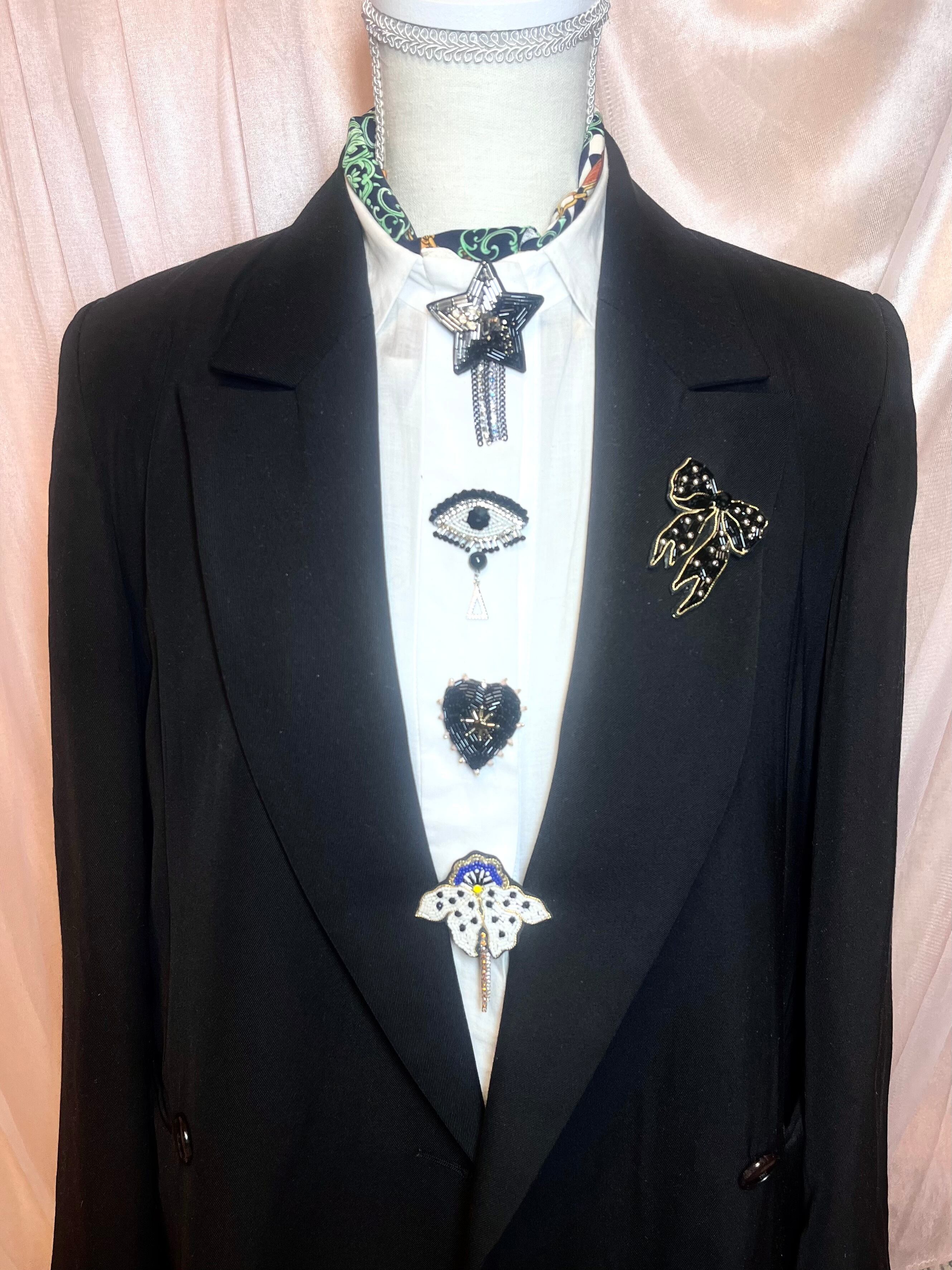 ジャケットやコート、ニット、バッグなどさまざまなスタイルでアクセントとしてお楽しみいただけます。また、ブローチとしてだけでなく、チョーカーやネックレスに通すことで、異なるファッションの楽しみ方が広がります。