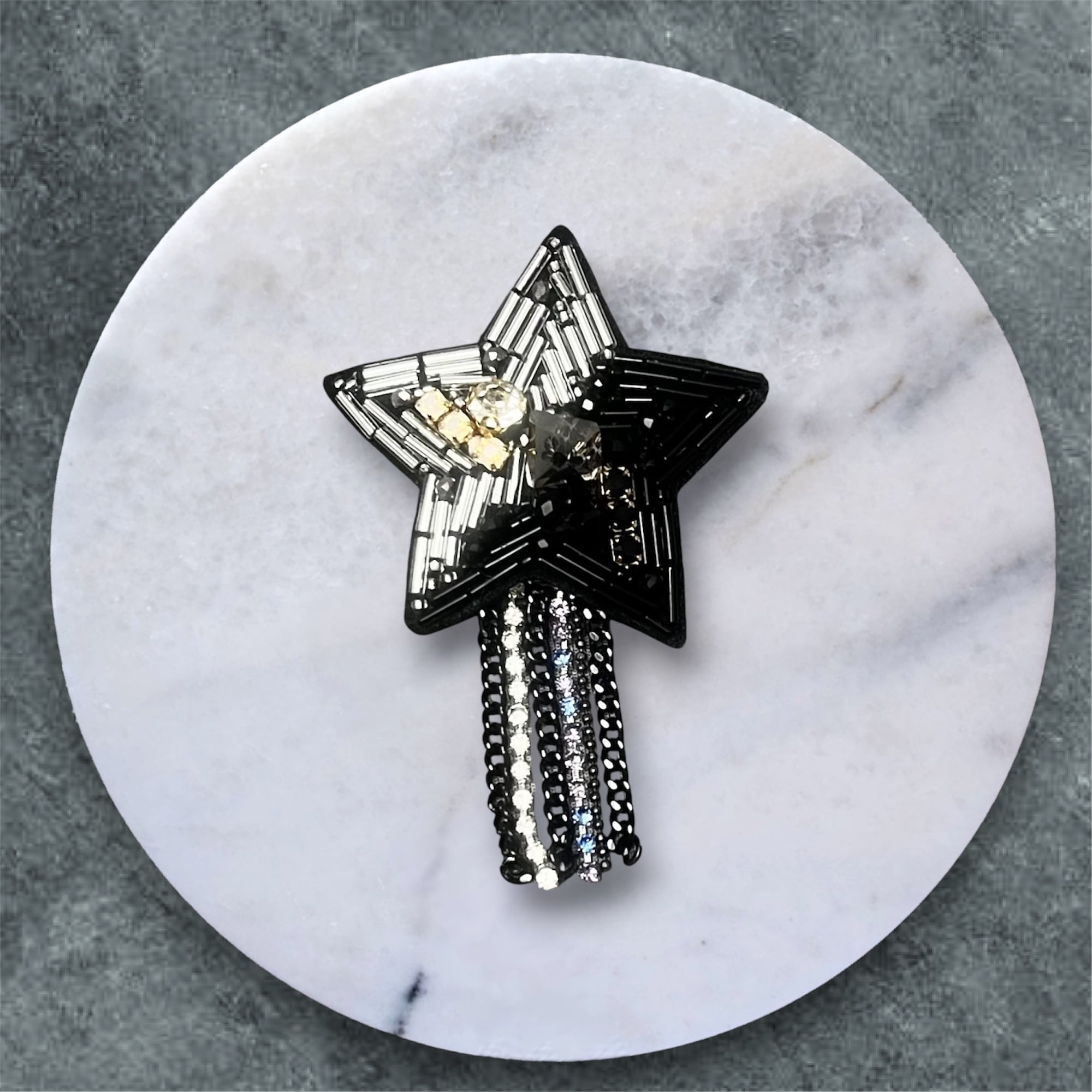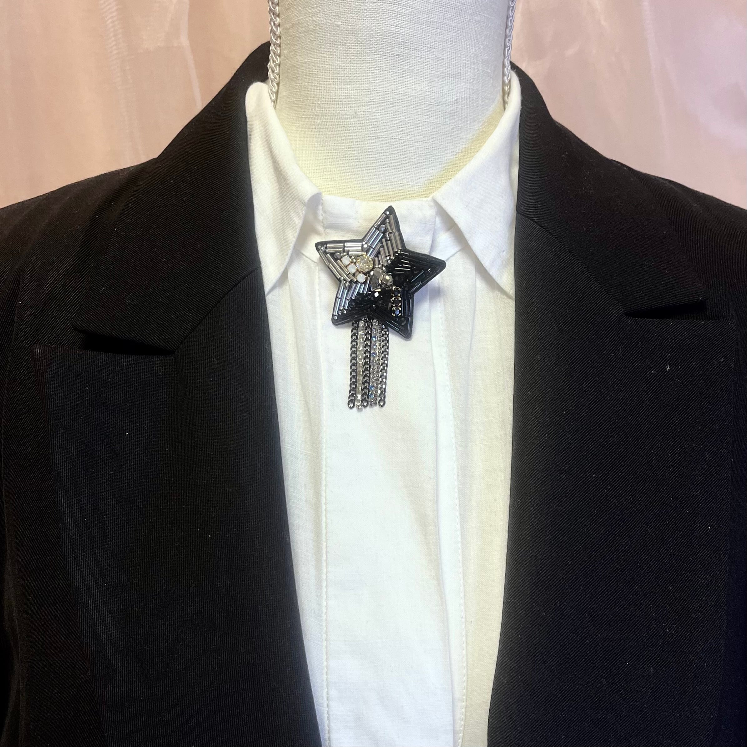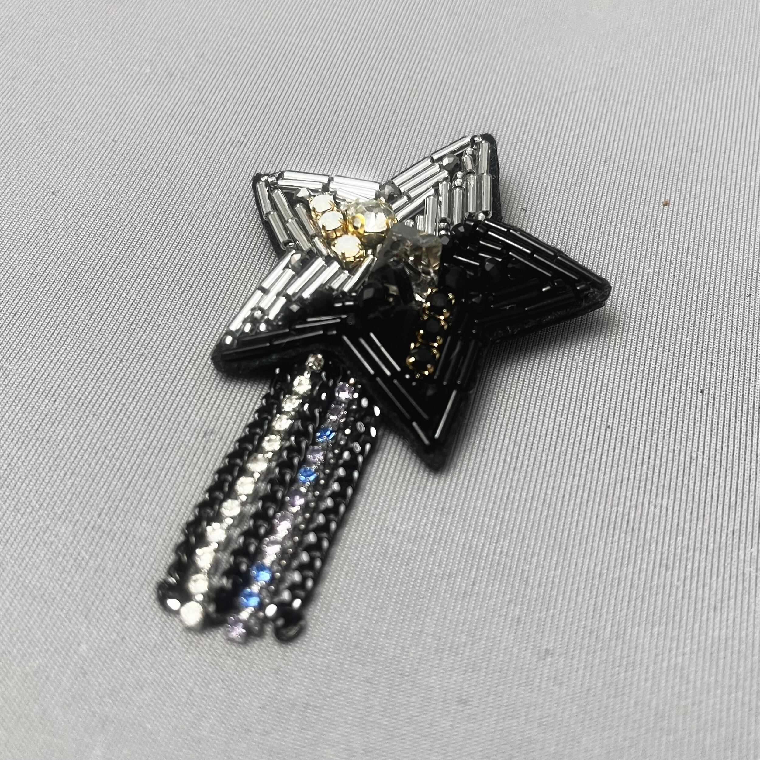 ビーズを使用して表現された、流れ星をイメージしたデザインが魅力的です。バイカラーの組み合わせがシンプルなコーディネートにアクセントを加え、華やかさを演出する特別なアイテムとなっています。