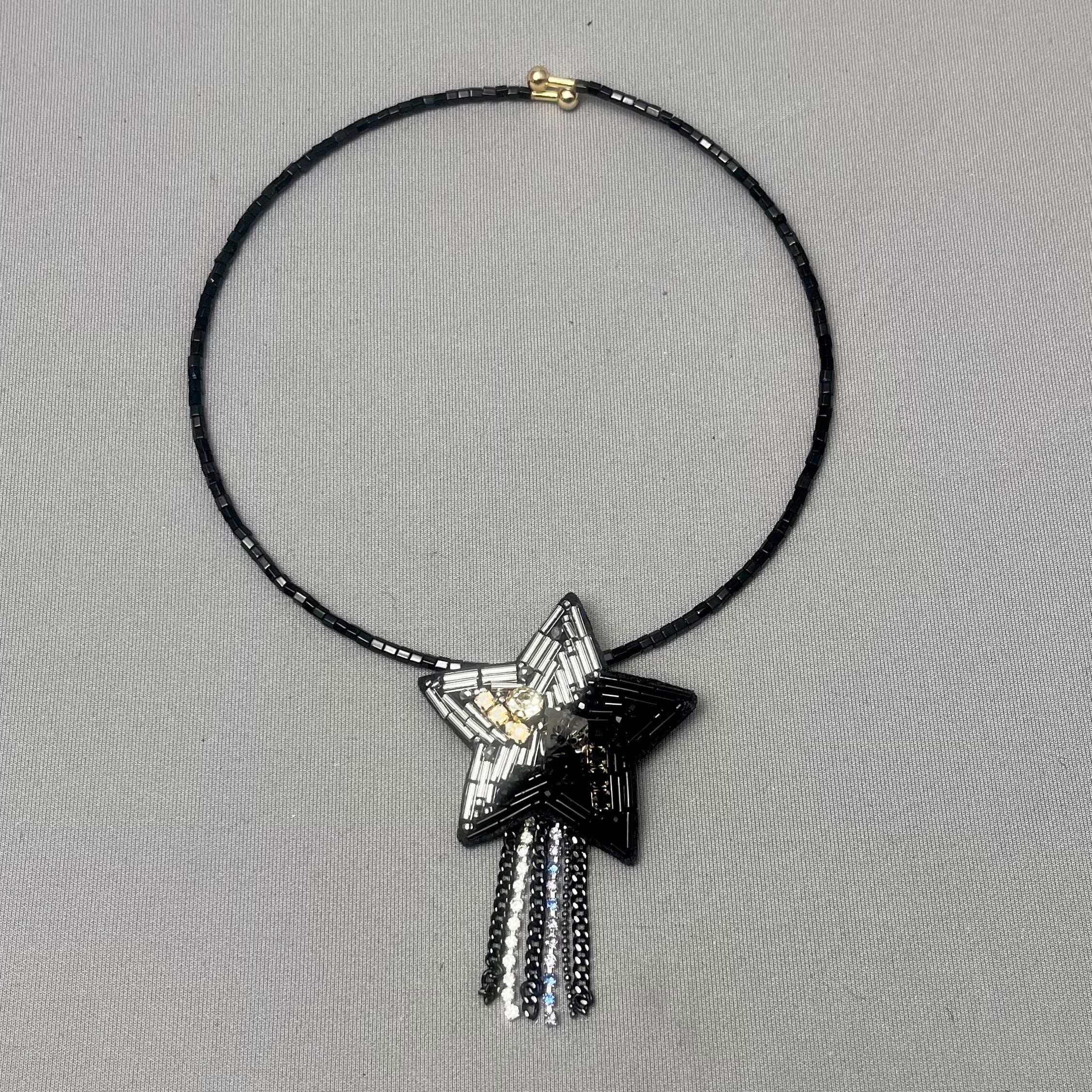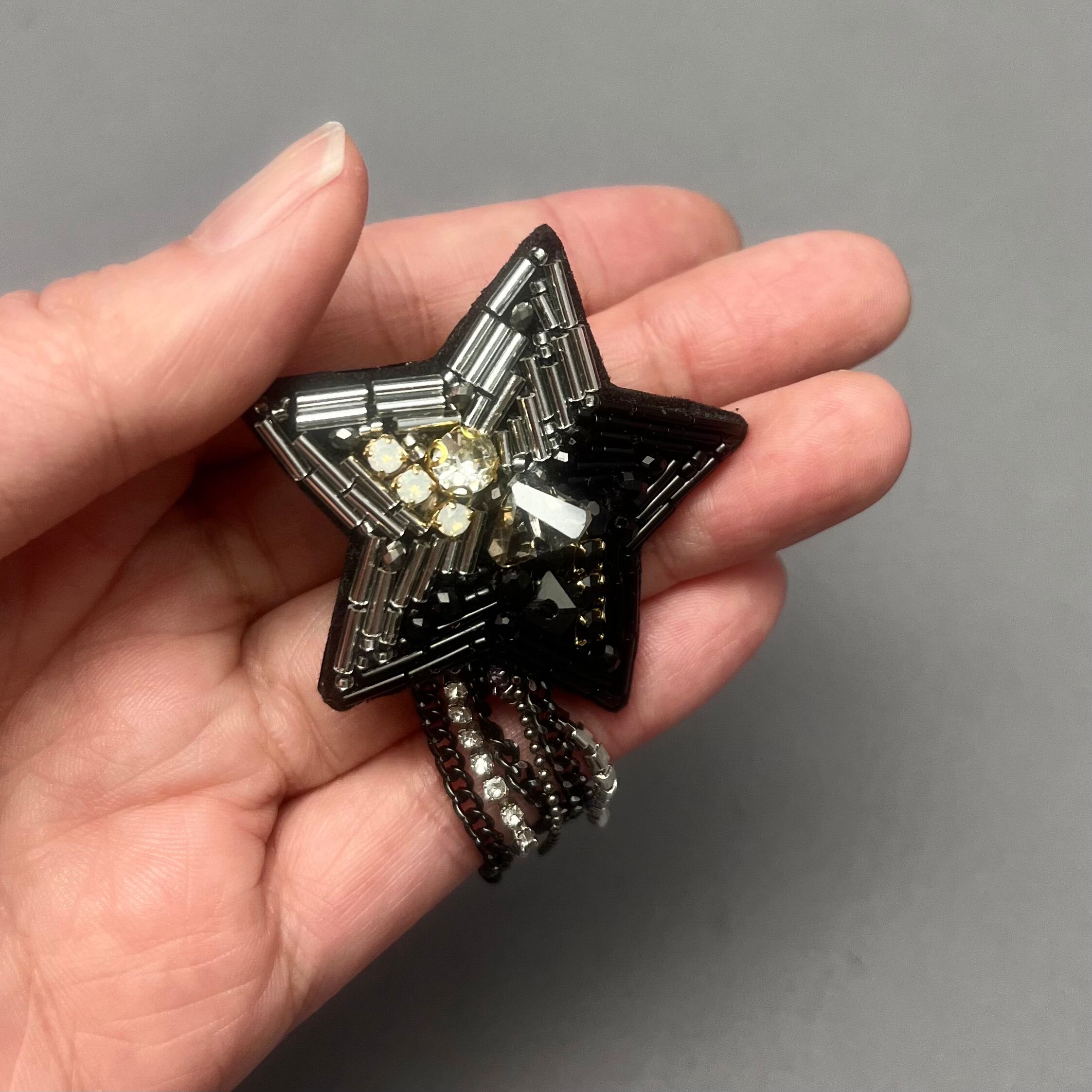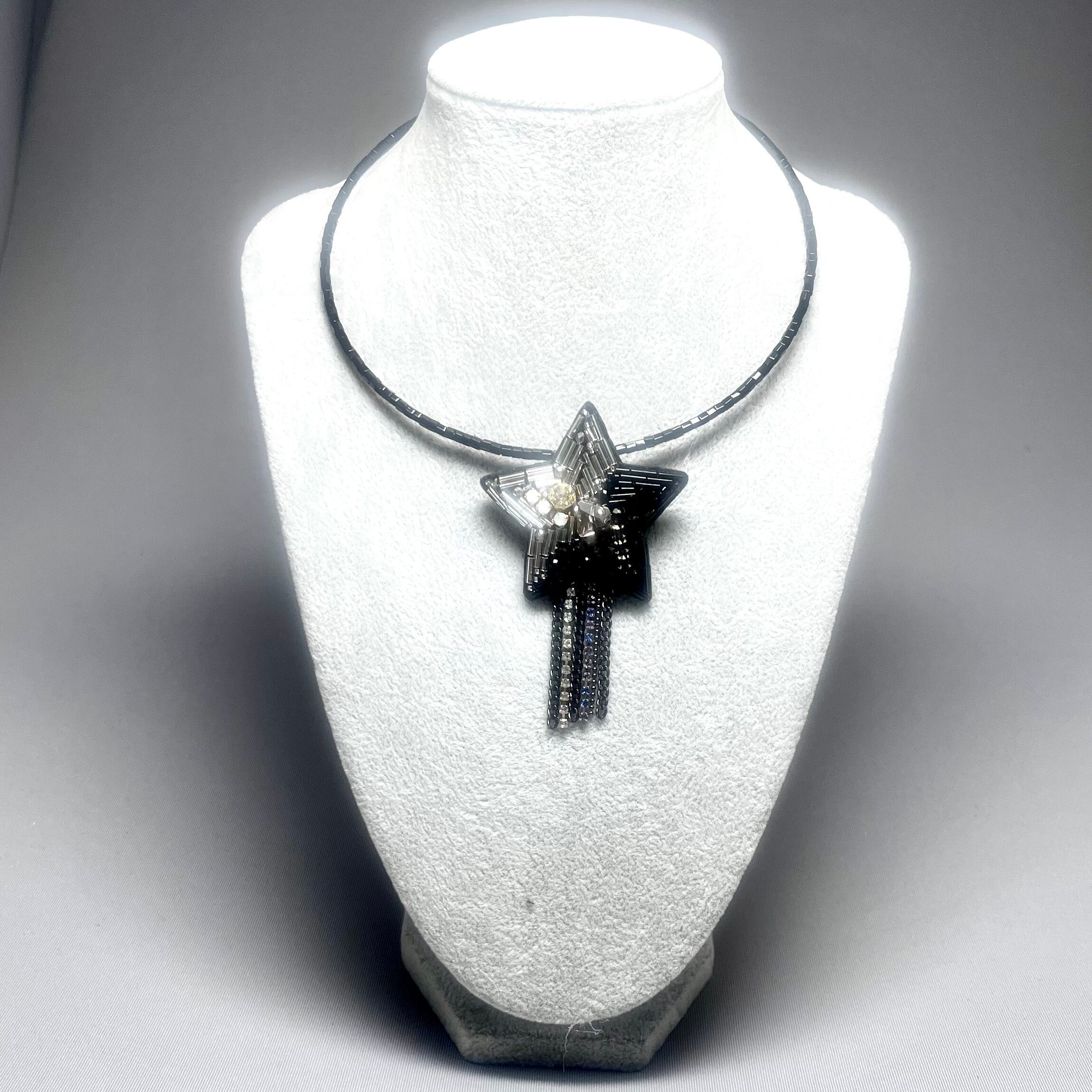 ビーズを使用して表現された、流れ星をイメージしたデザインが魅力的です。バイカラーの組み合わせがシンプルなコーディネートにアクセントを加え、華やかさを演出する特別なアイテムとなっています。