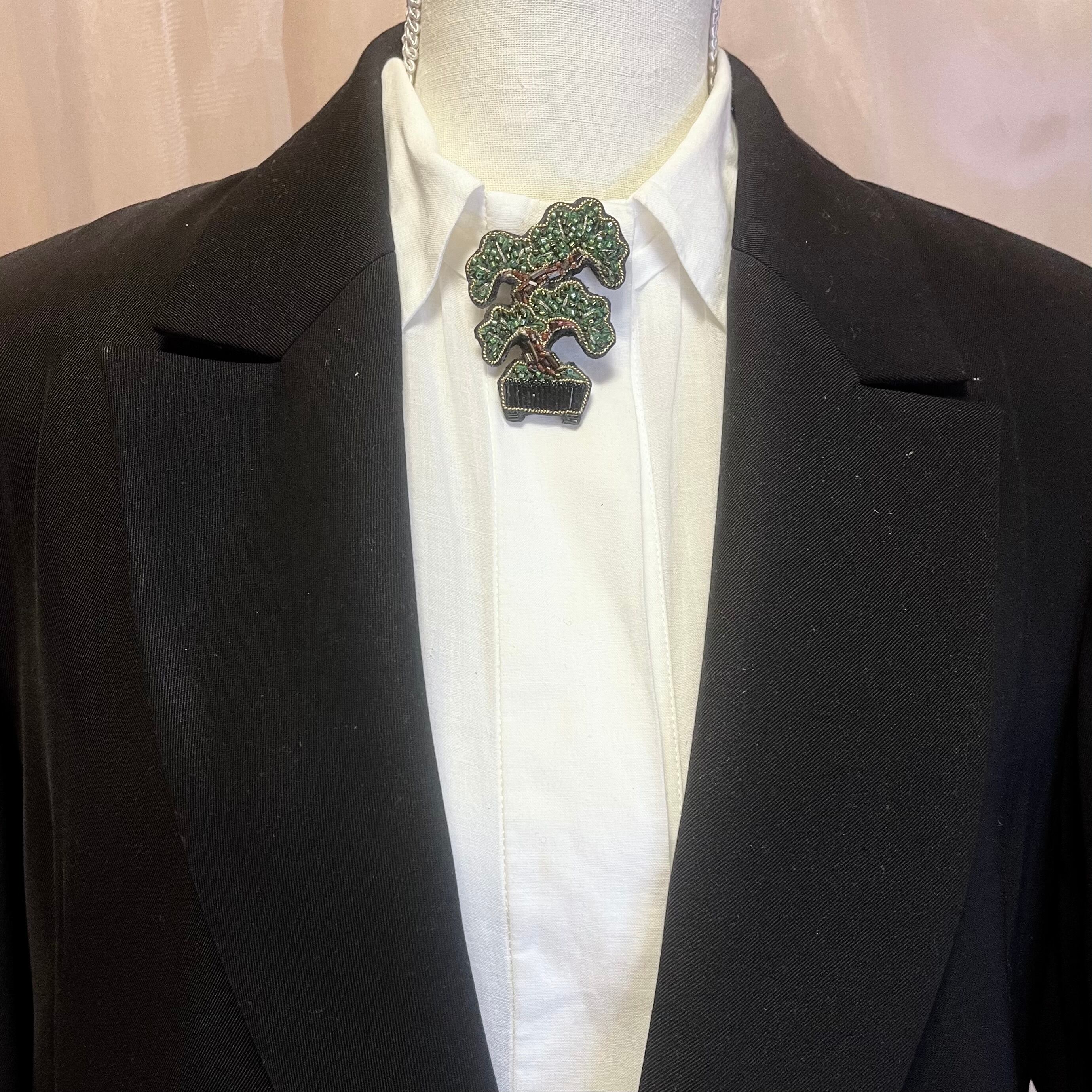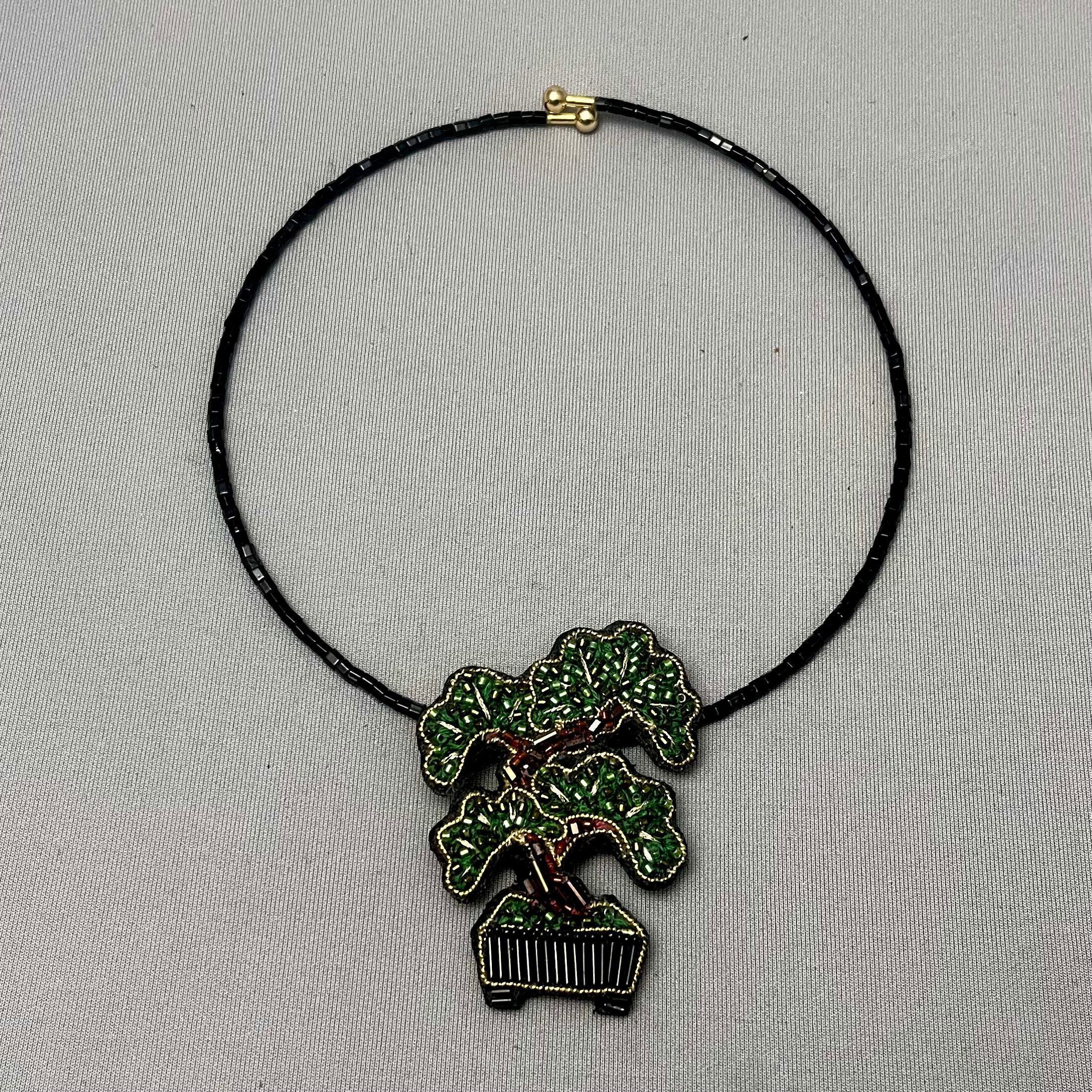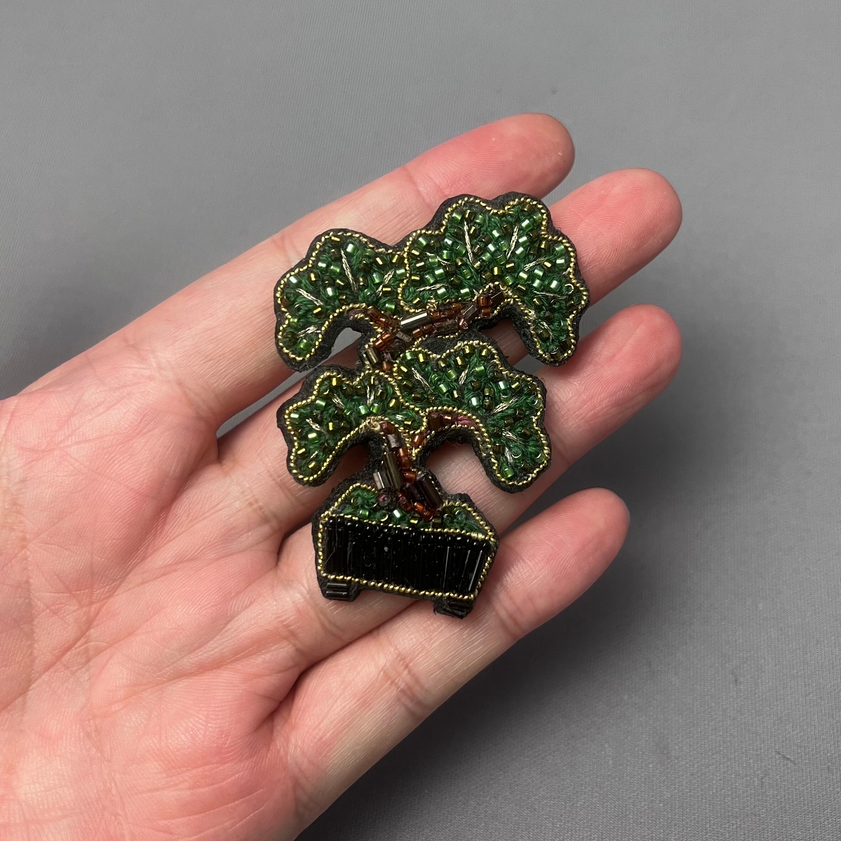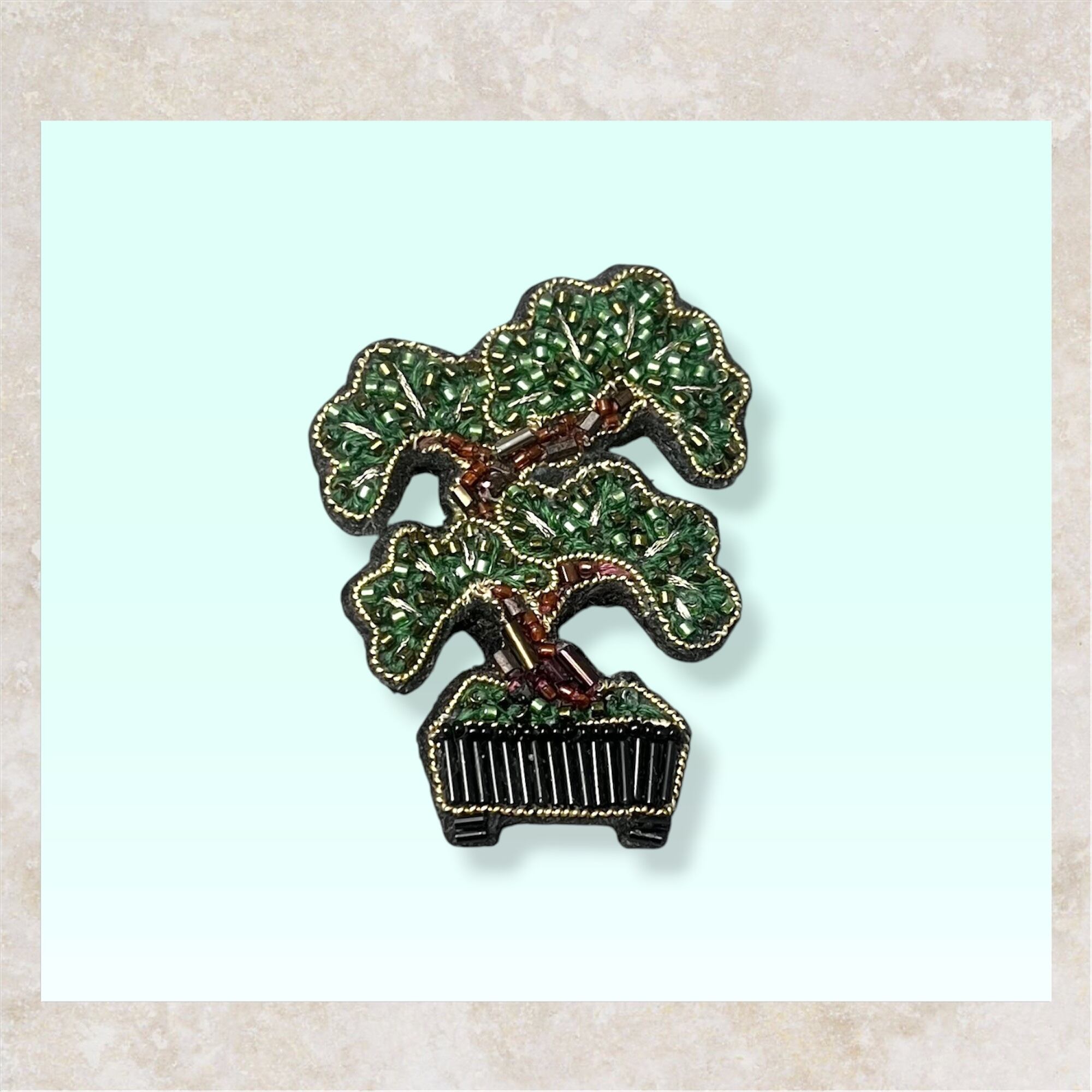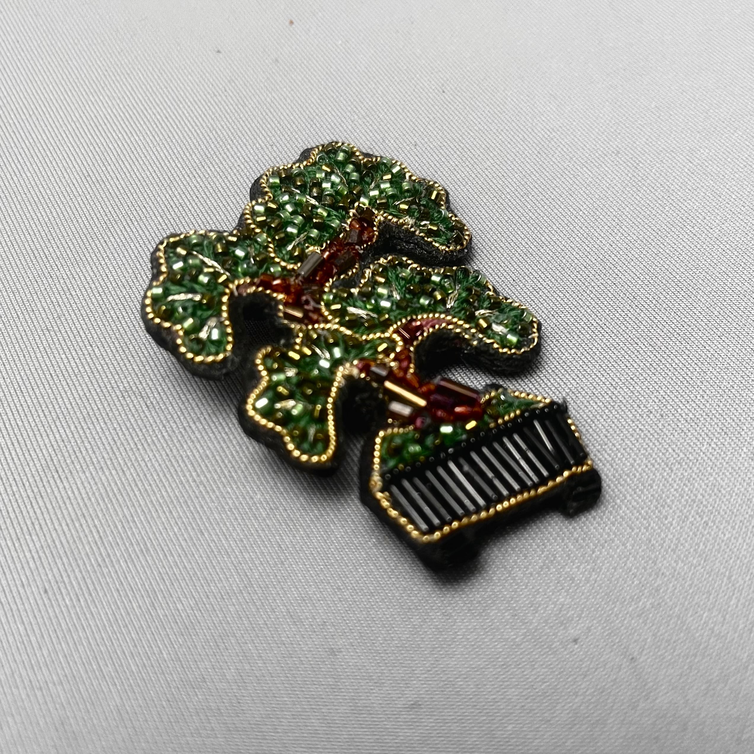 繊細なビーズ刺繍で仕立てた、盆栽モチーフのブローチ。