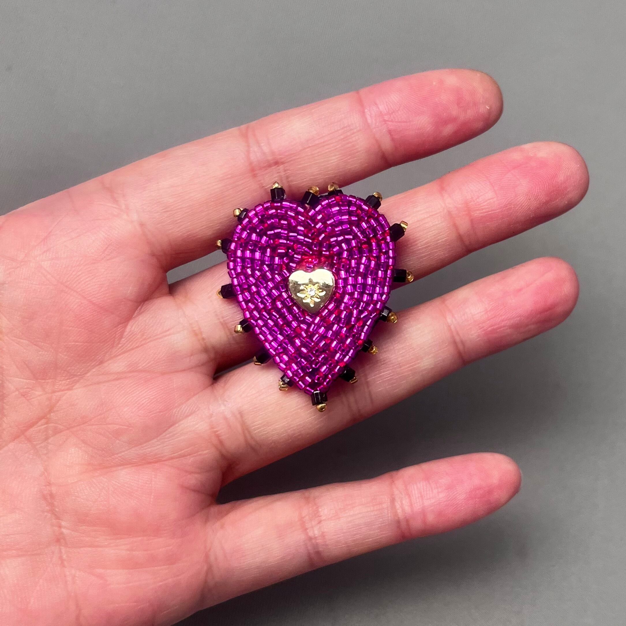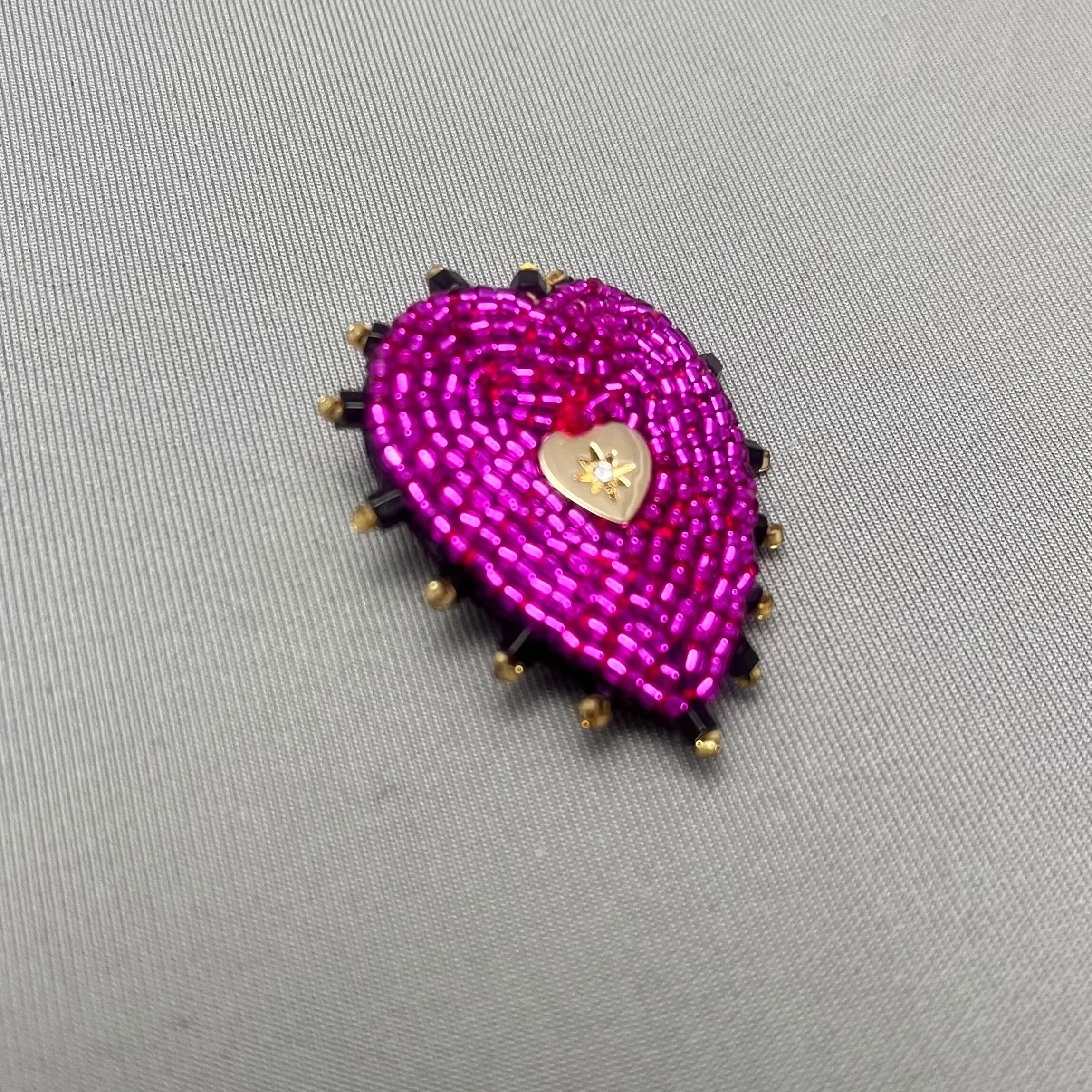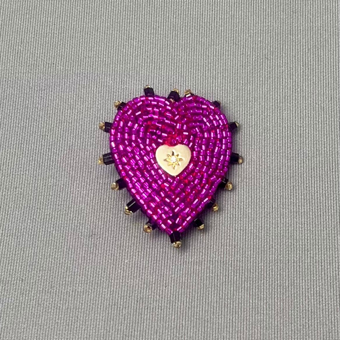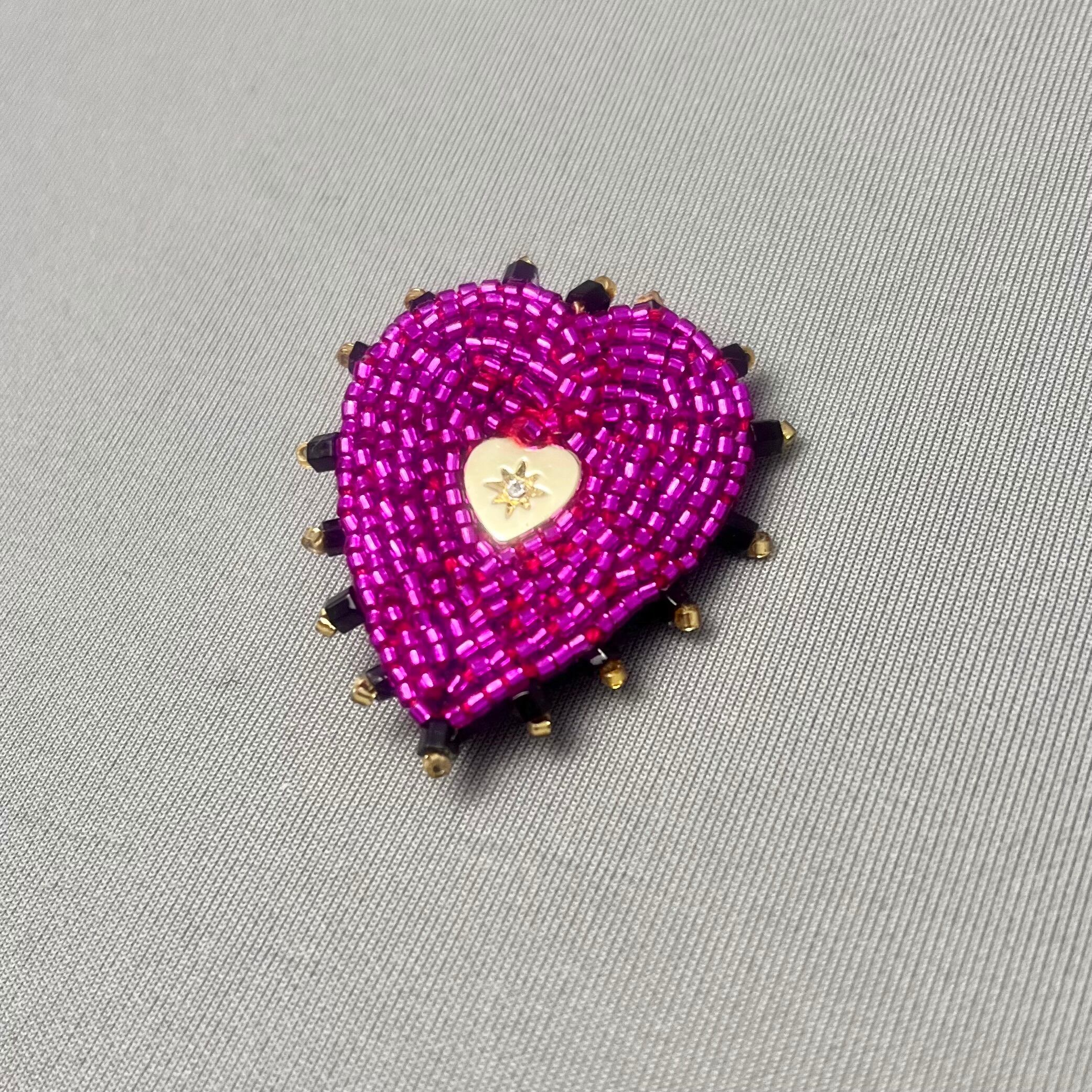 ビーズ刺繍で仕上げられた、ハートモチーフのブローチ。鮮やかなマゼンダピンクと黒の縁取りで鉄板の可愛さ。