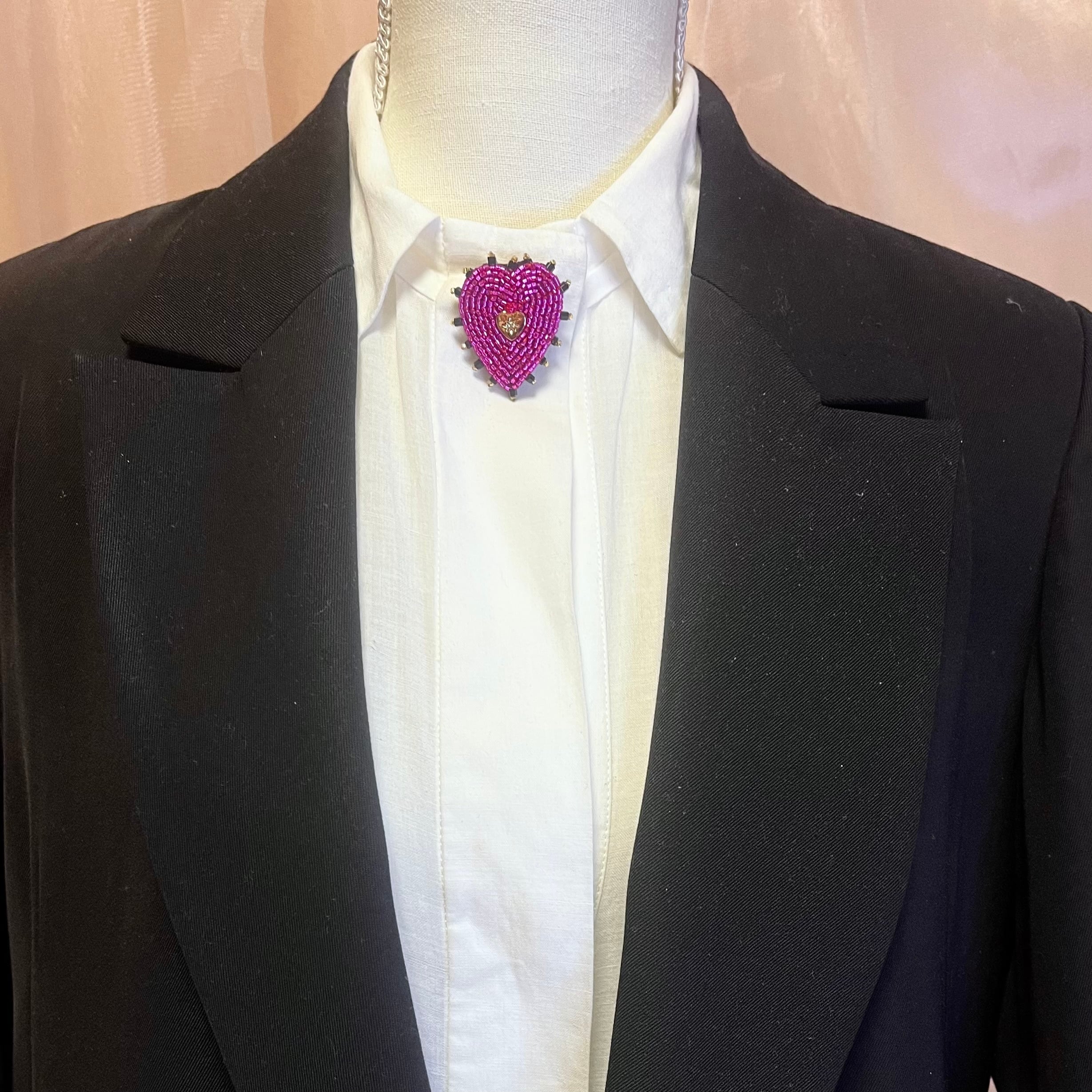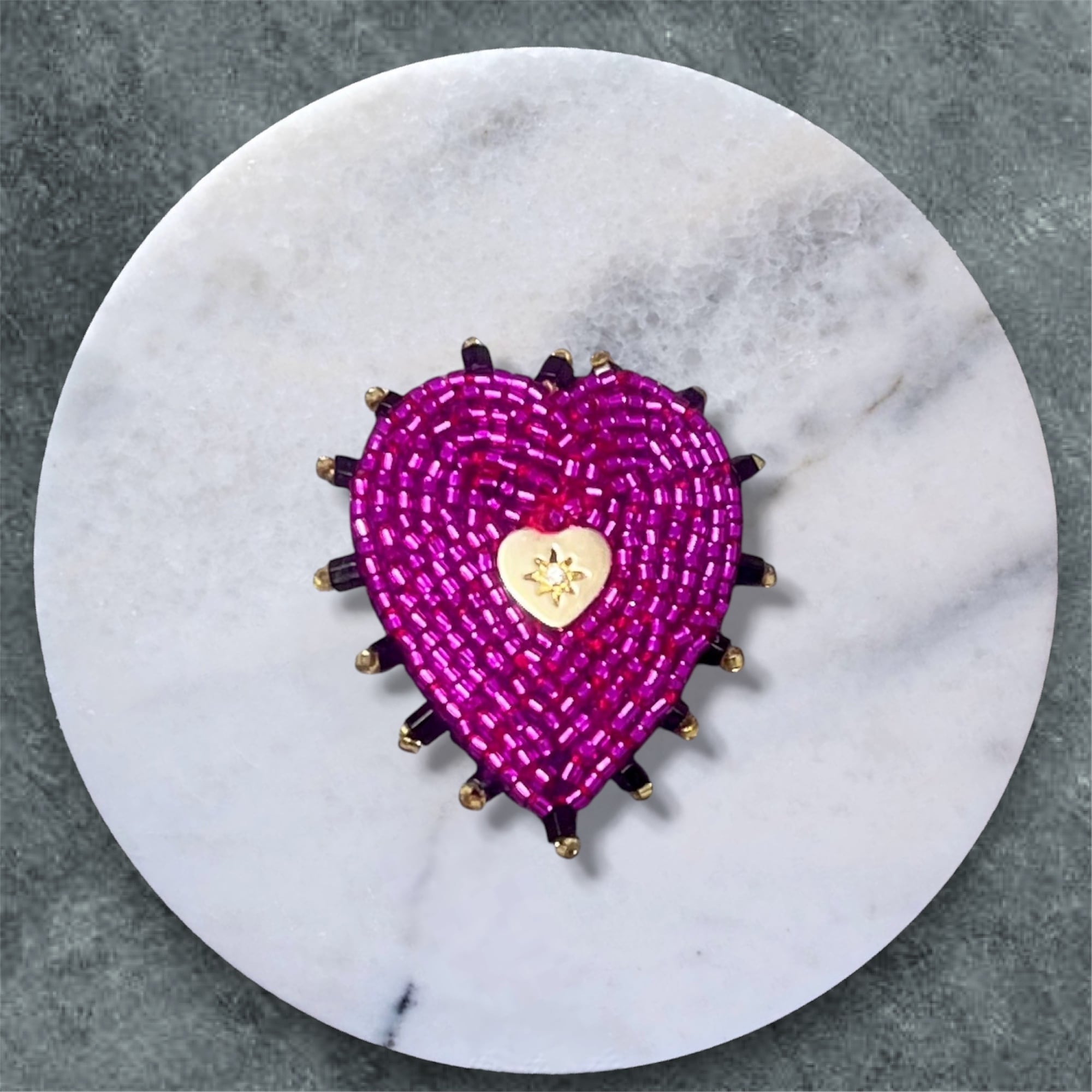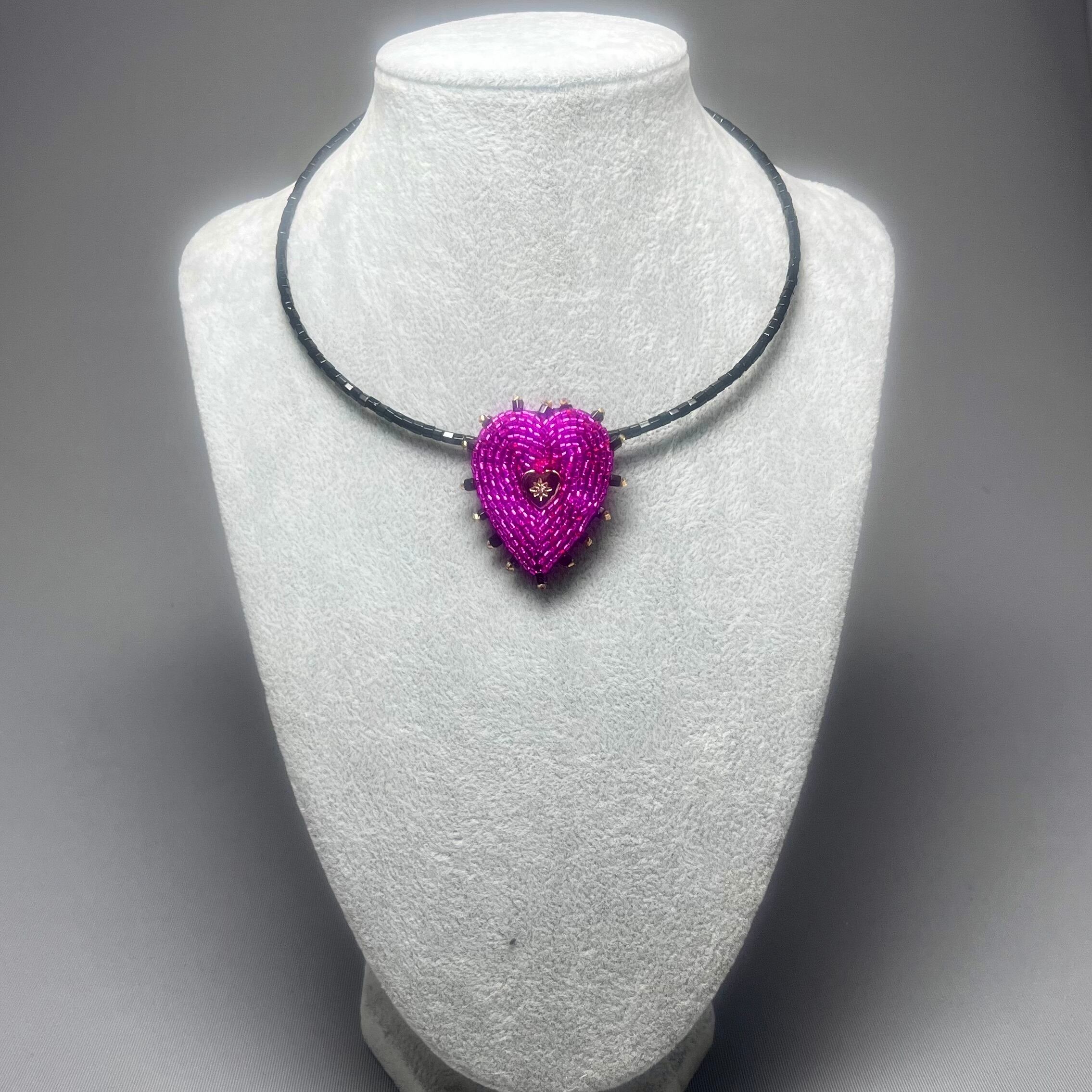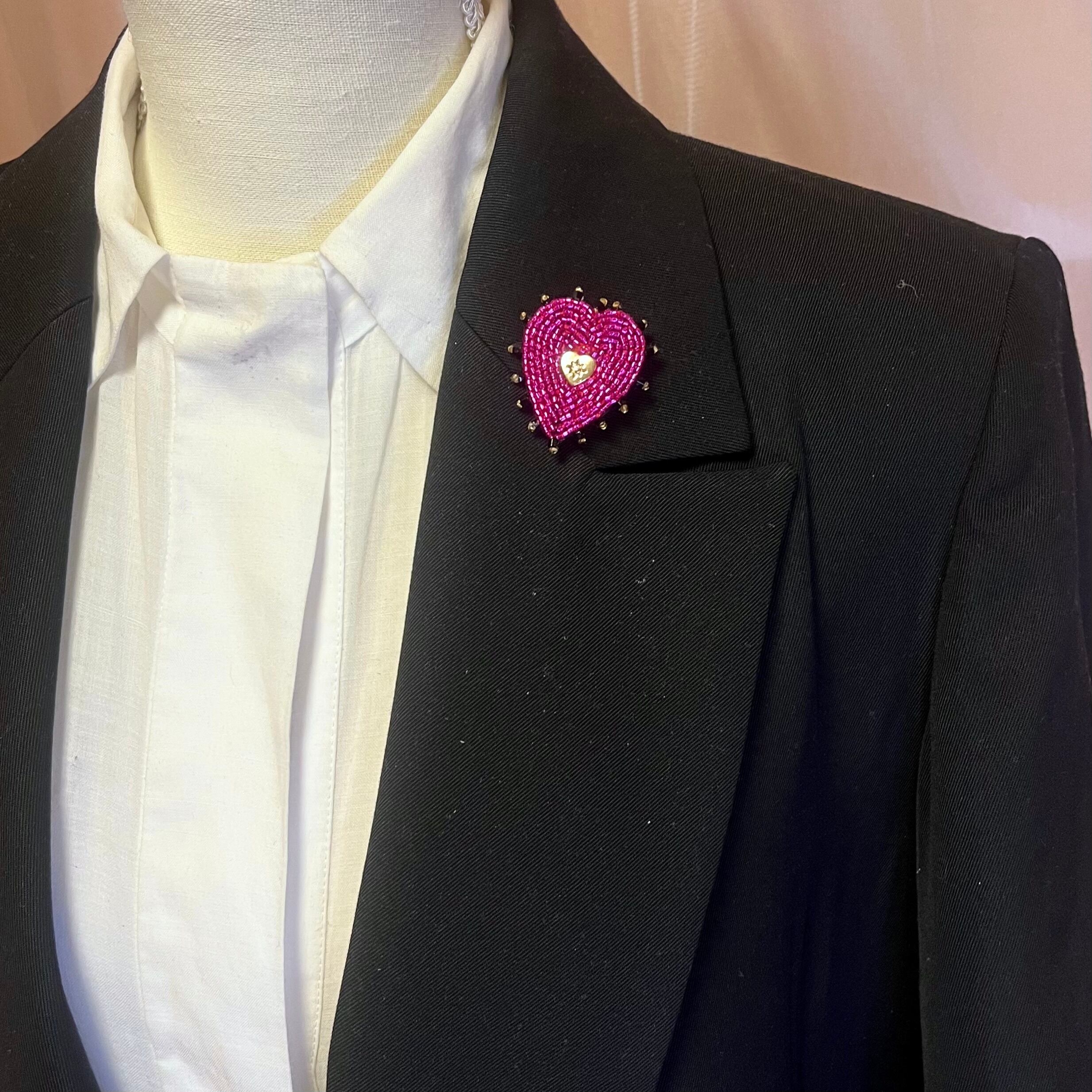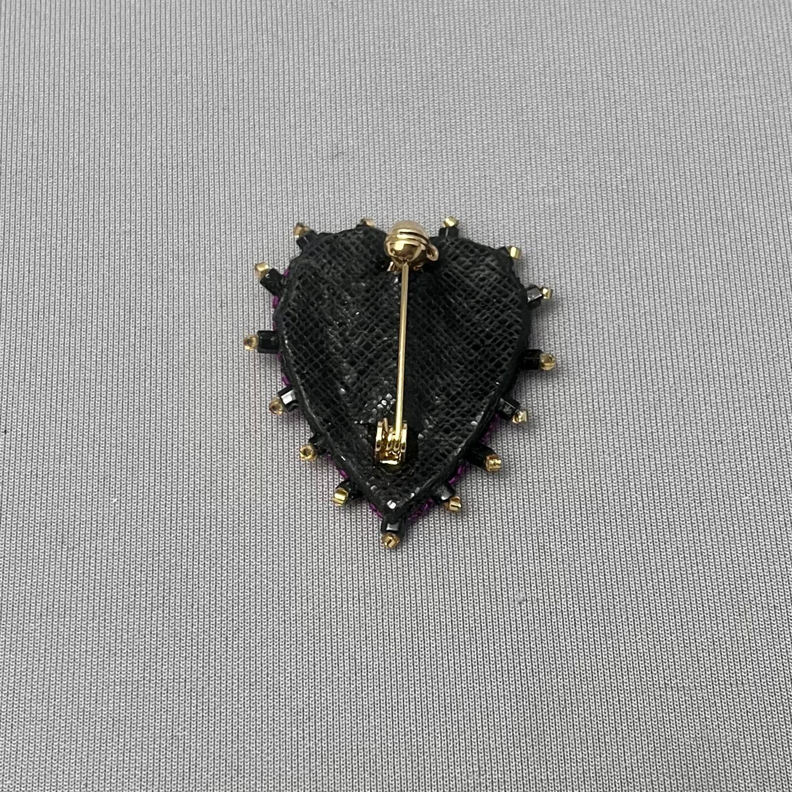 ビーズ刺繍で仕上げられた、ハートモチーフのブローチ。鮮やかなマゼンダピンクと黒の縁取りで鉄板の可愛さ。