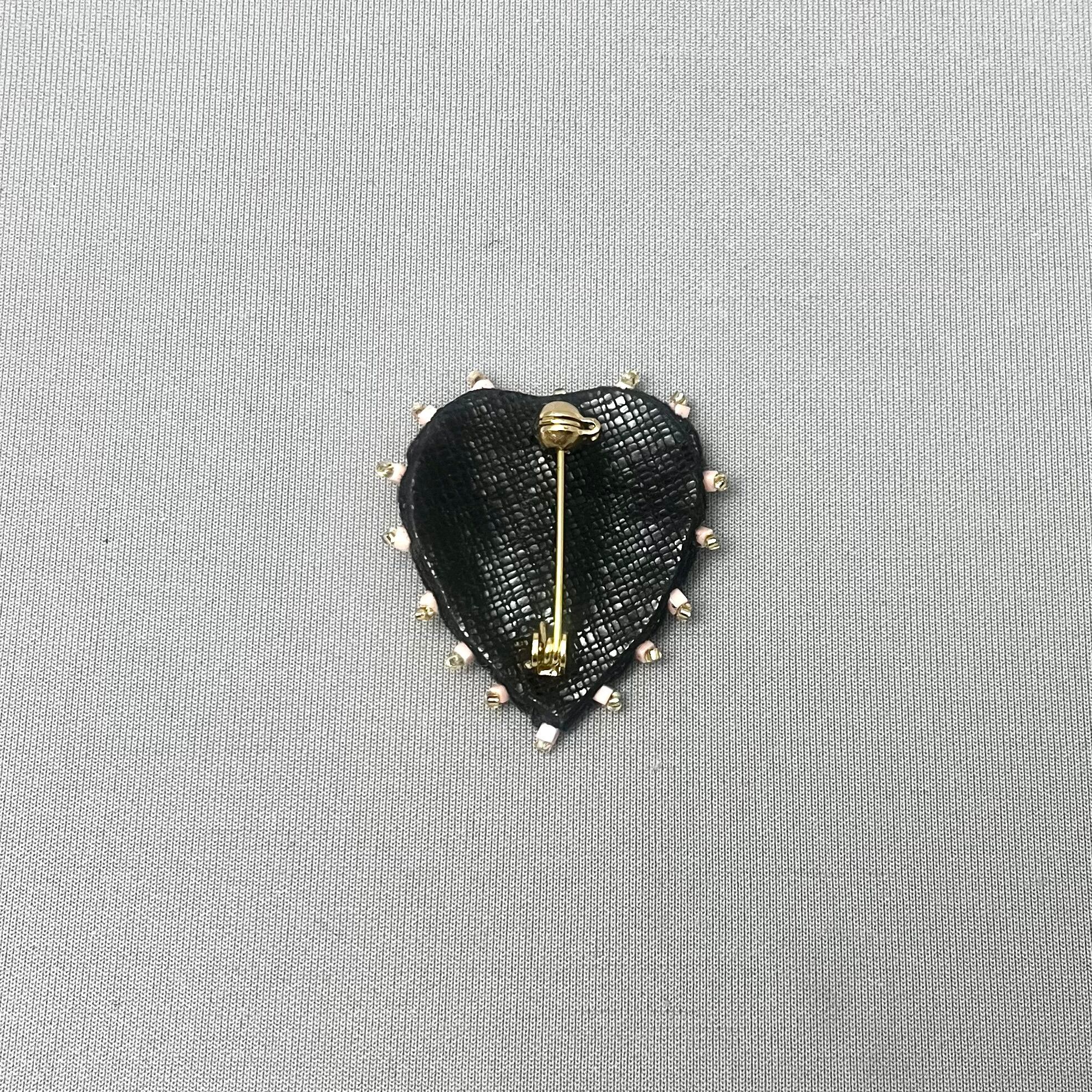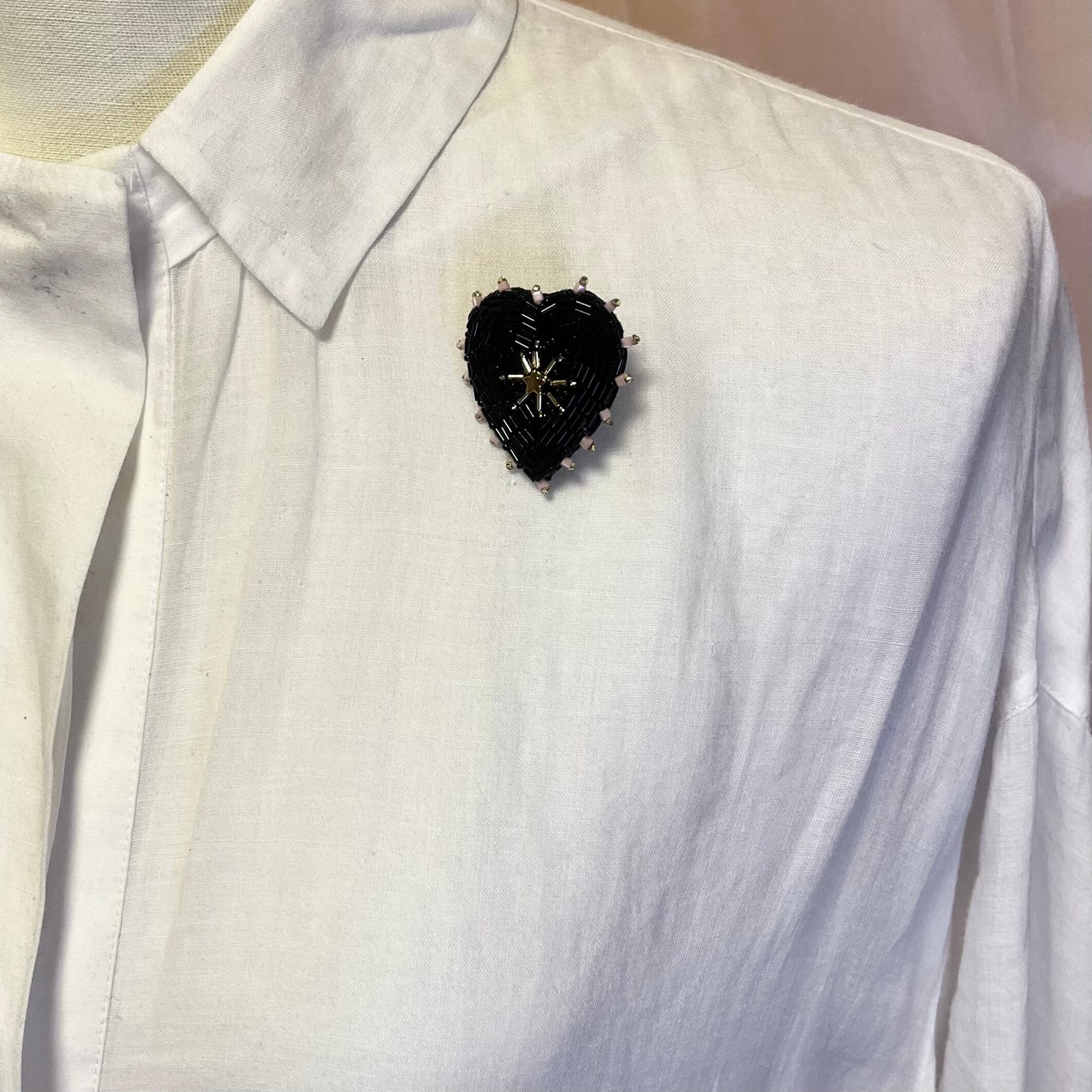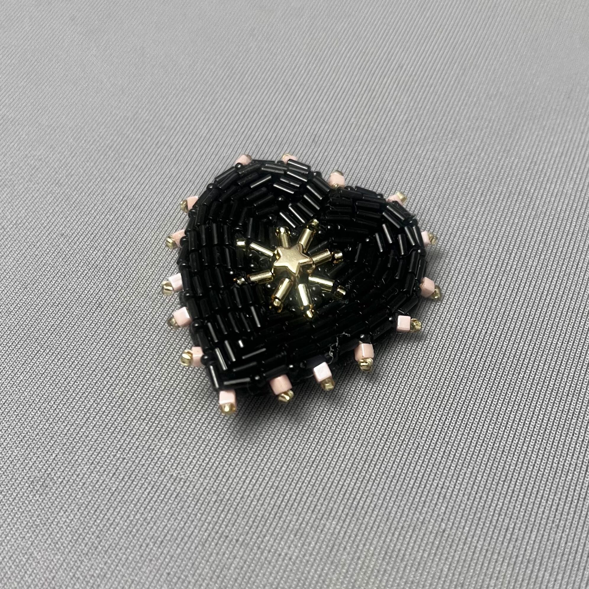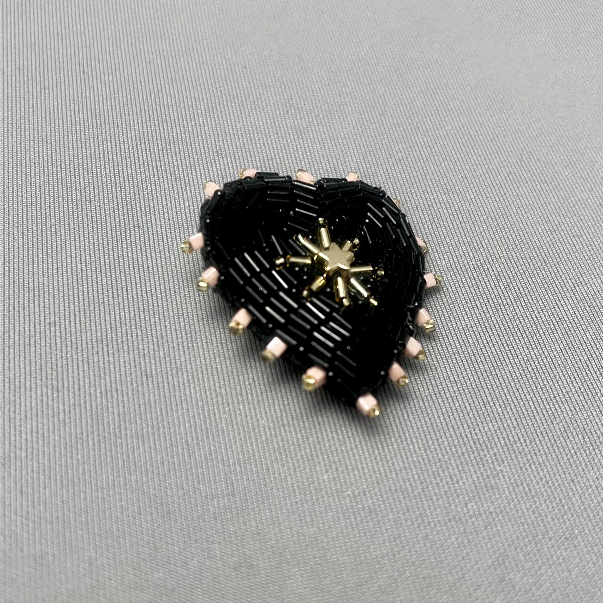 ビーズ刺繍で丁寧に仕上げた、ブラックハートモチーフのブローチ。艶感のある黒色のビーズが大人の魅力を引き立て、シンプルな着こなしに特別なアクセントを加えます。