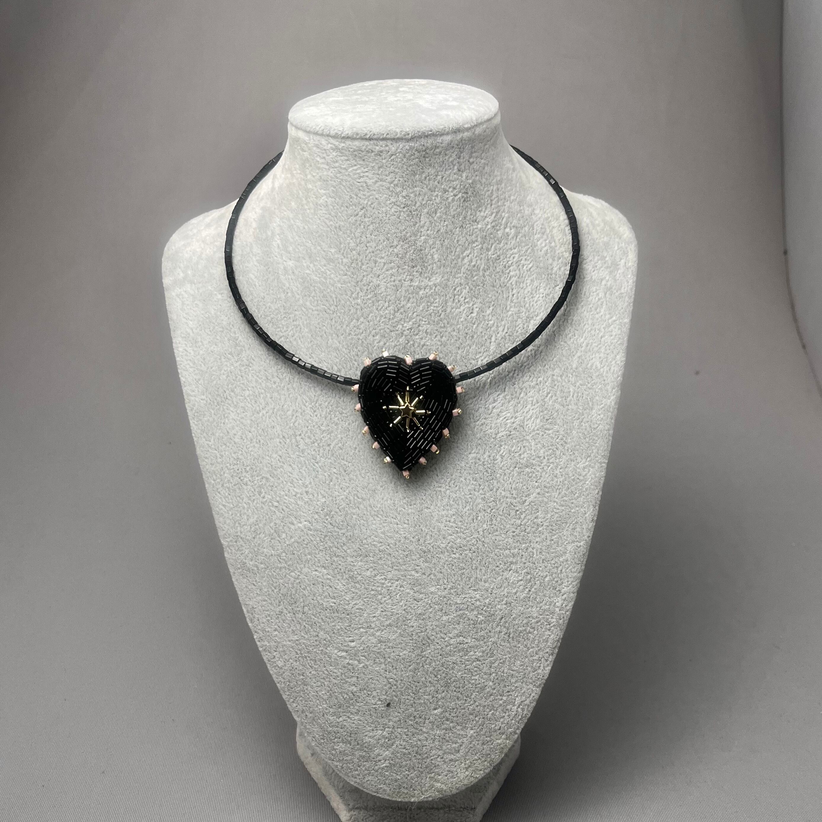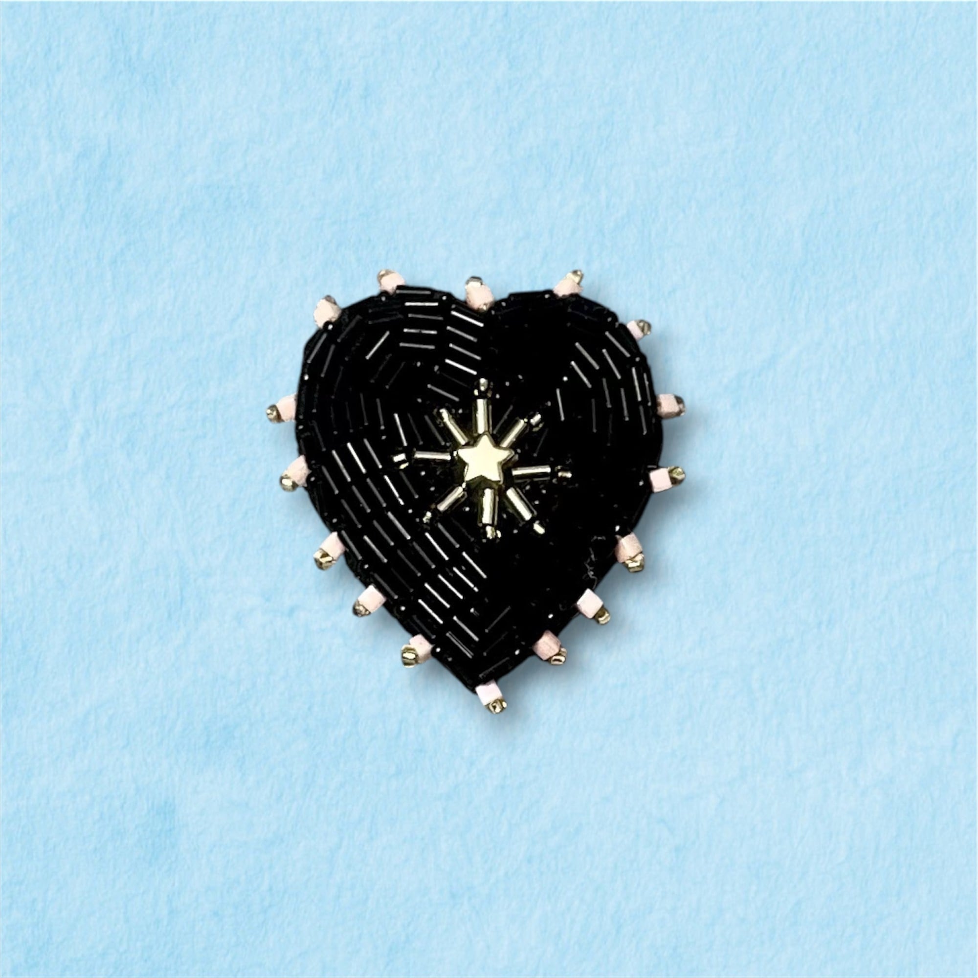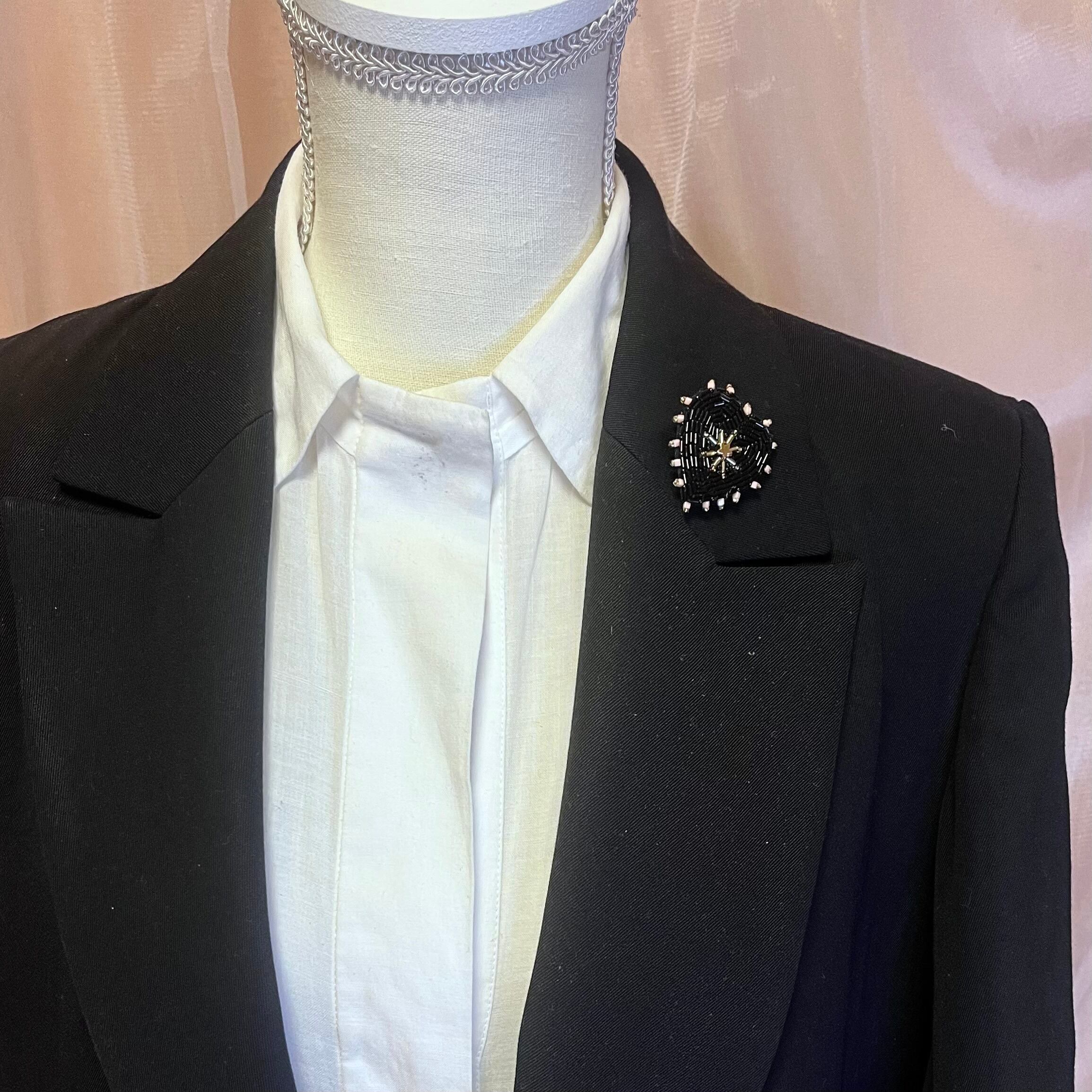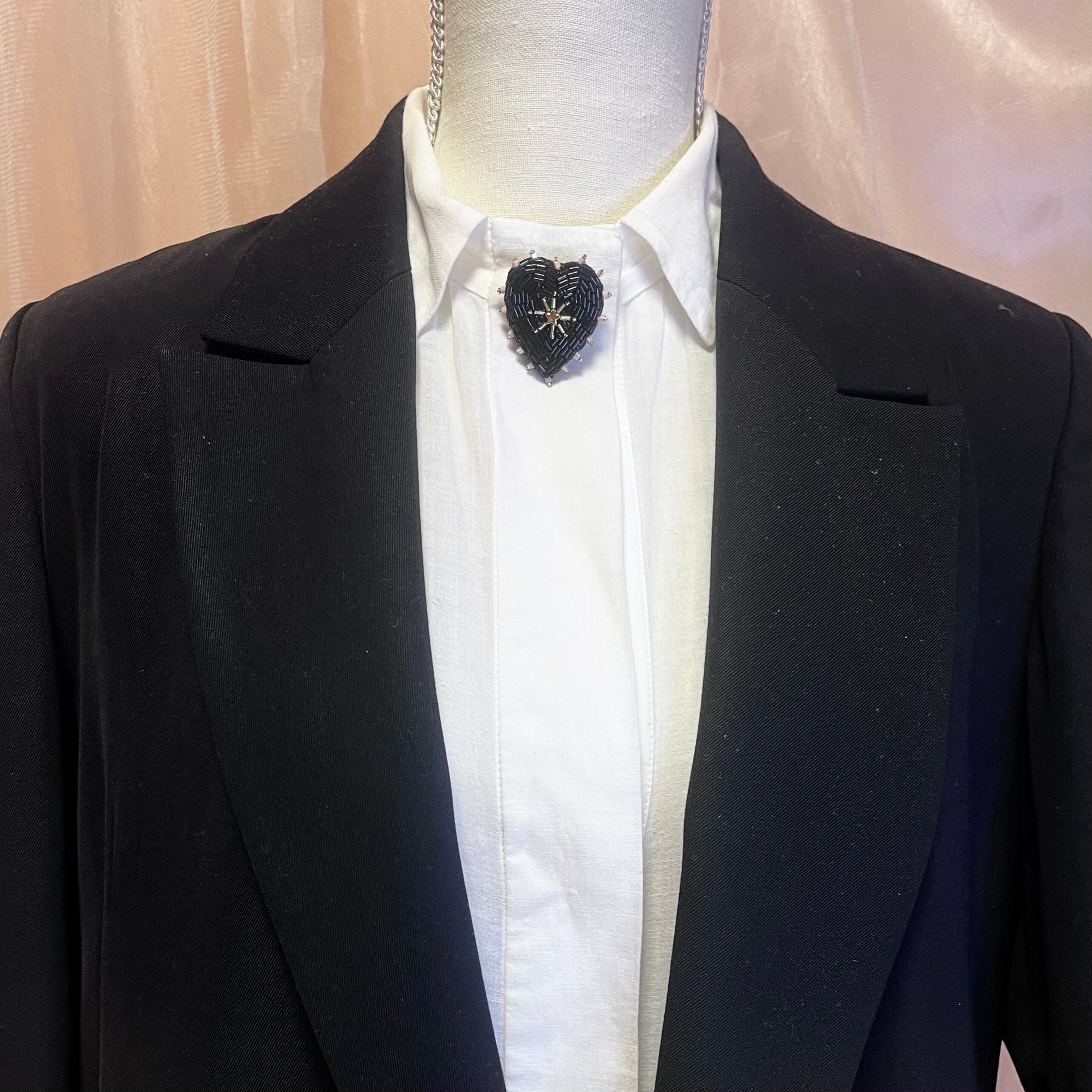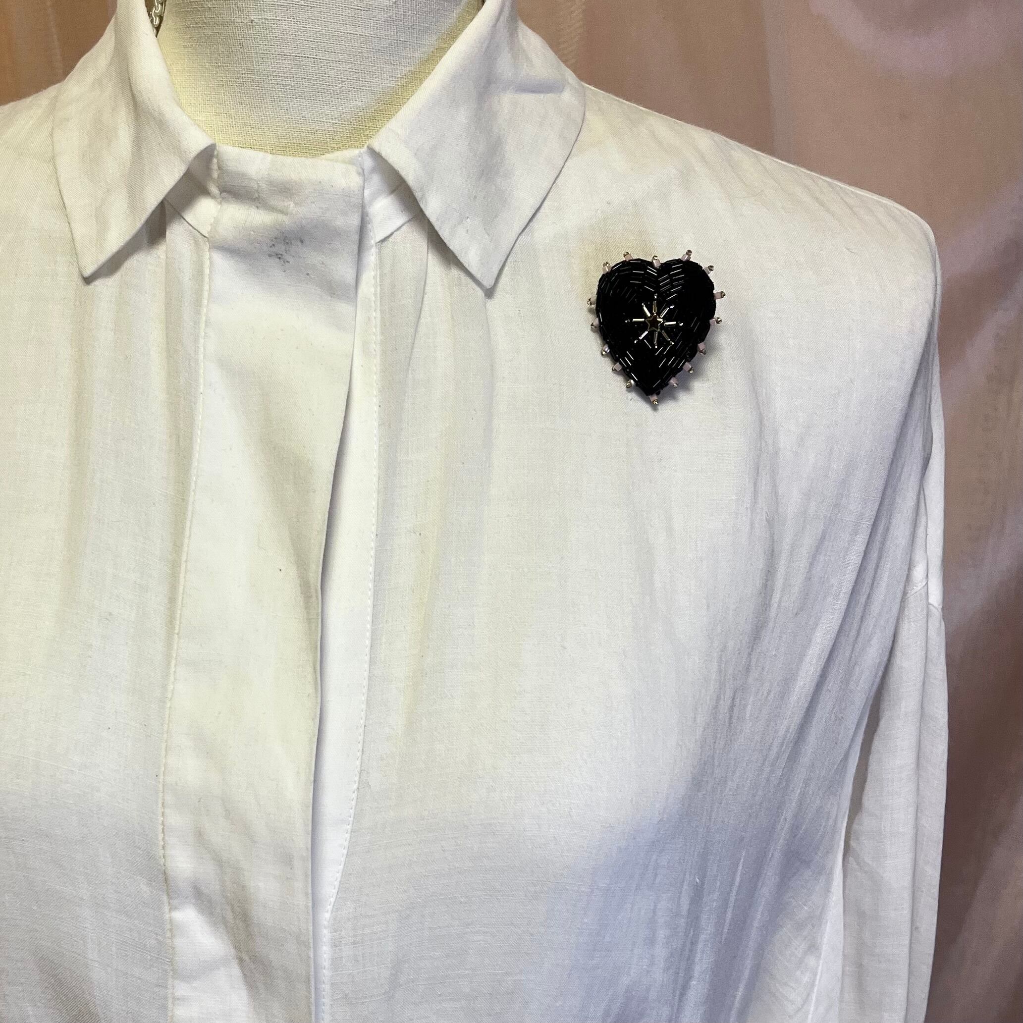 ビーズ刺繍で丁寧に仕上げた、ブラックハートモチーフのブローチ。艶感のある黒色のビーズが大人の魅力を引き立て、シンプルな着こなしに特別なアクセントを加えます。