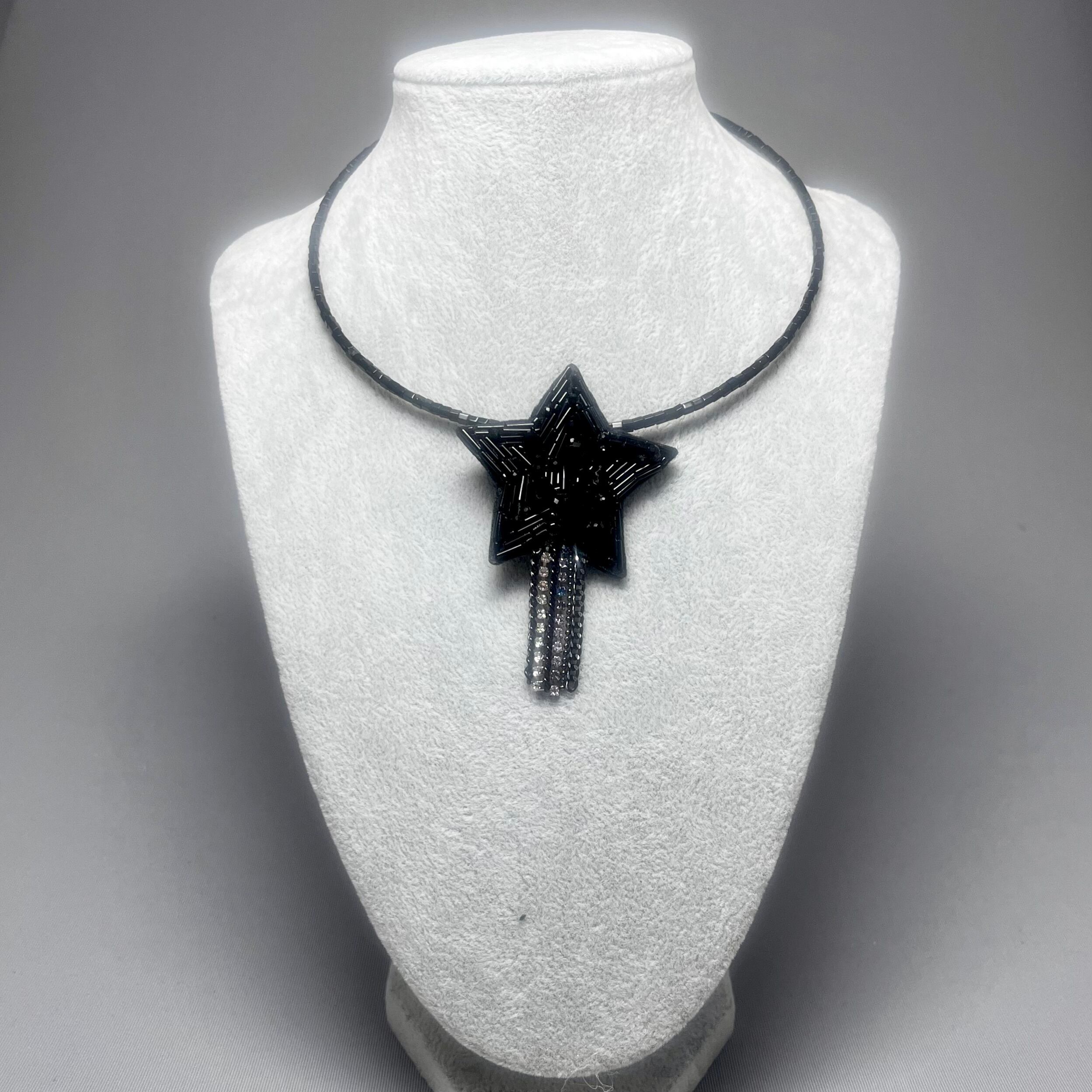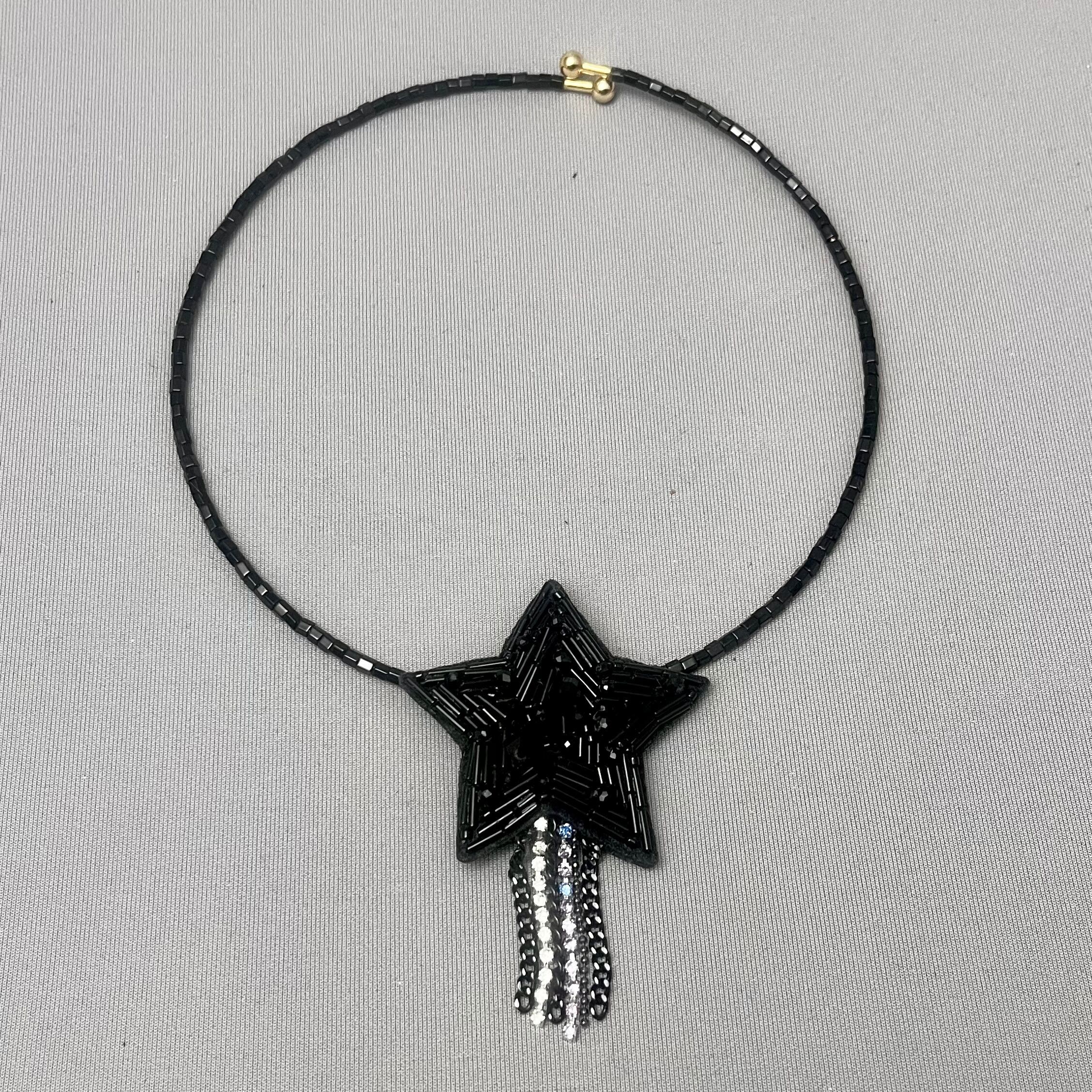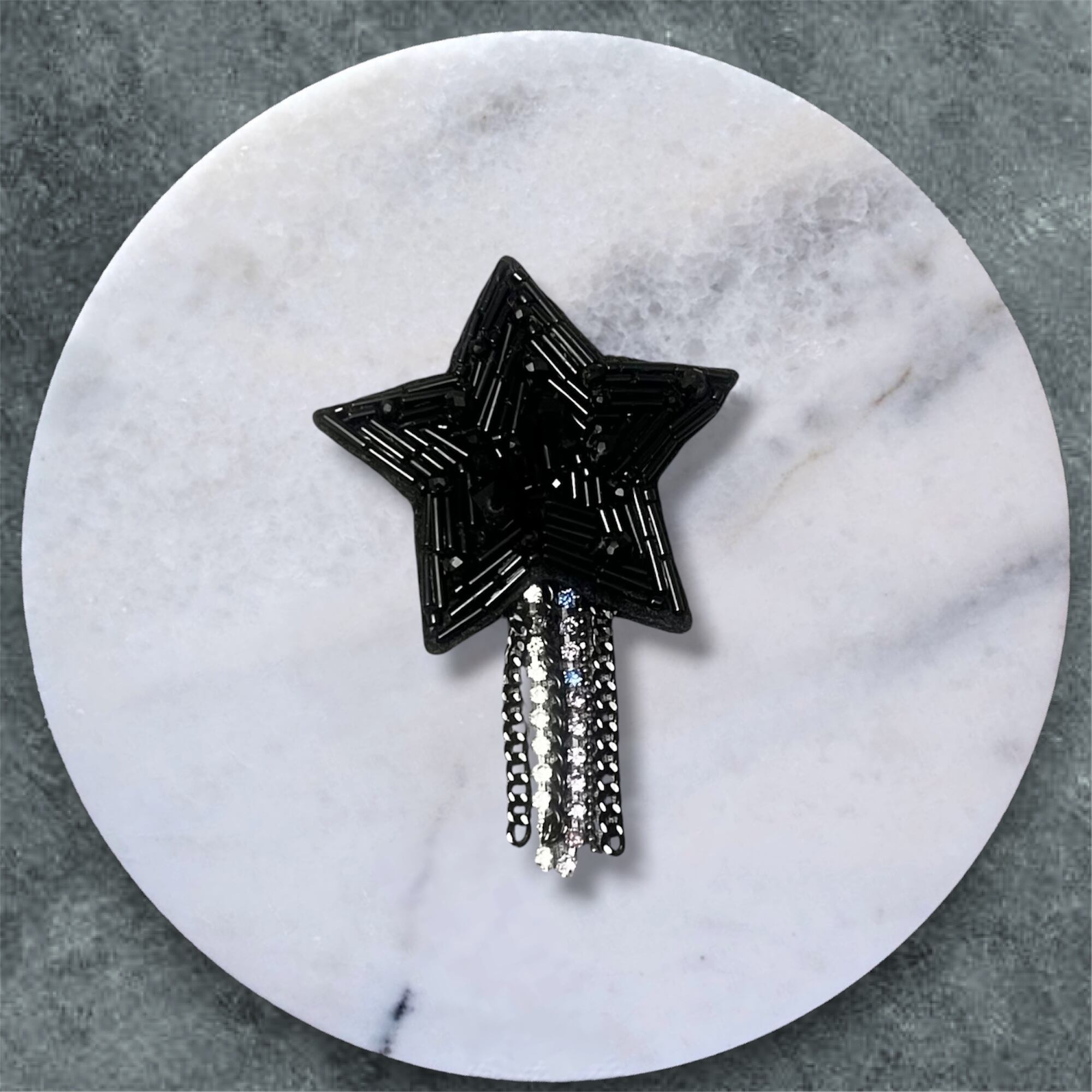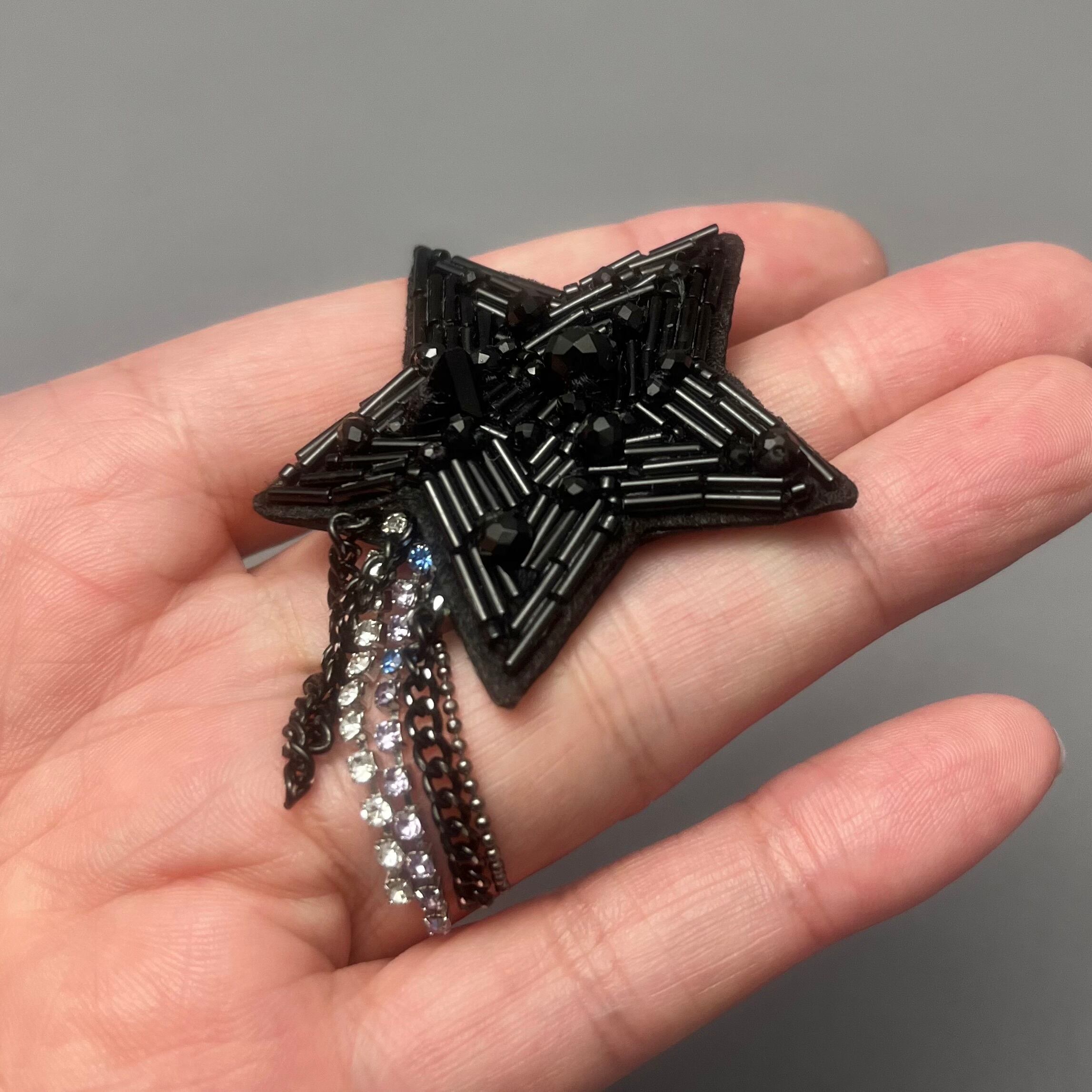 ビーズ刺繍で仕上げられた、星のブローチ。