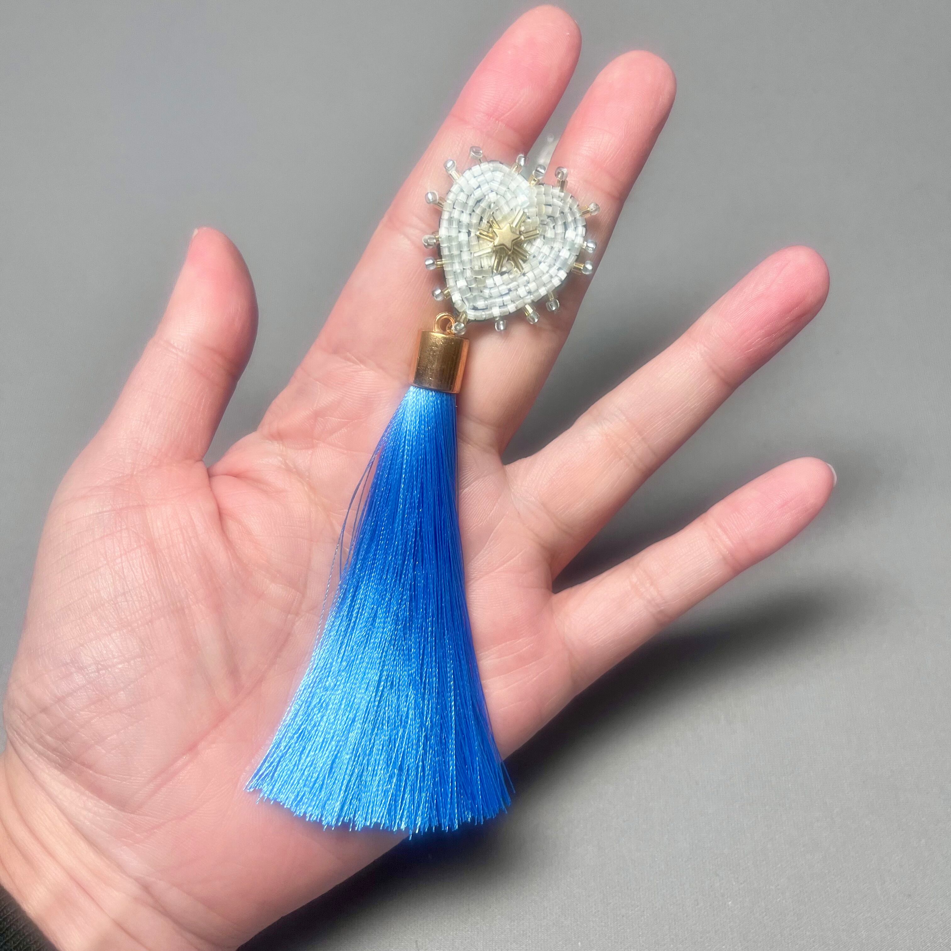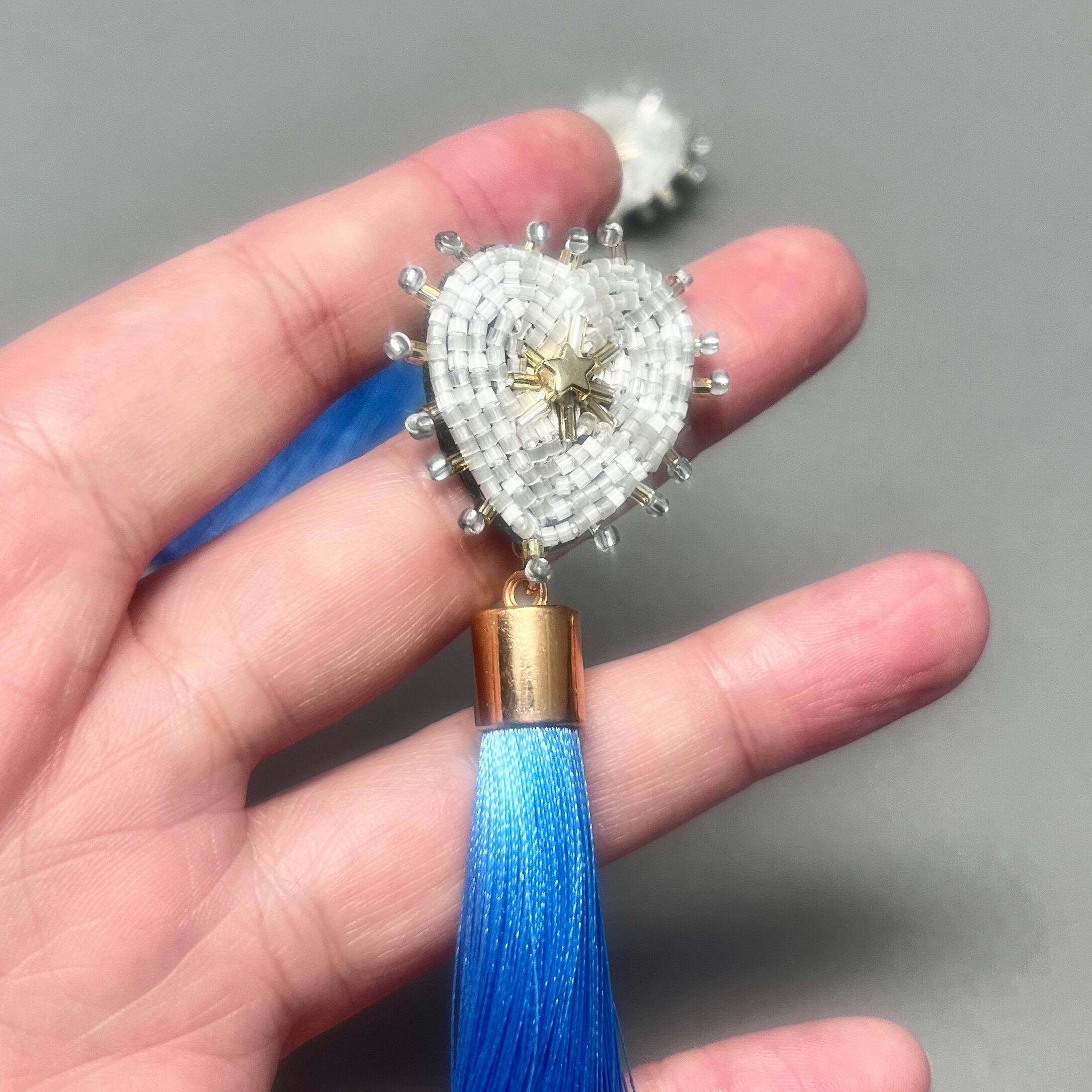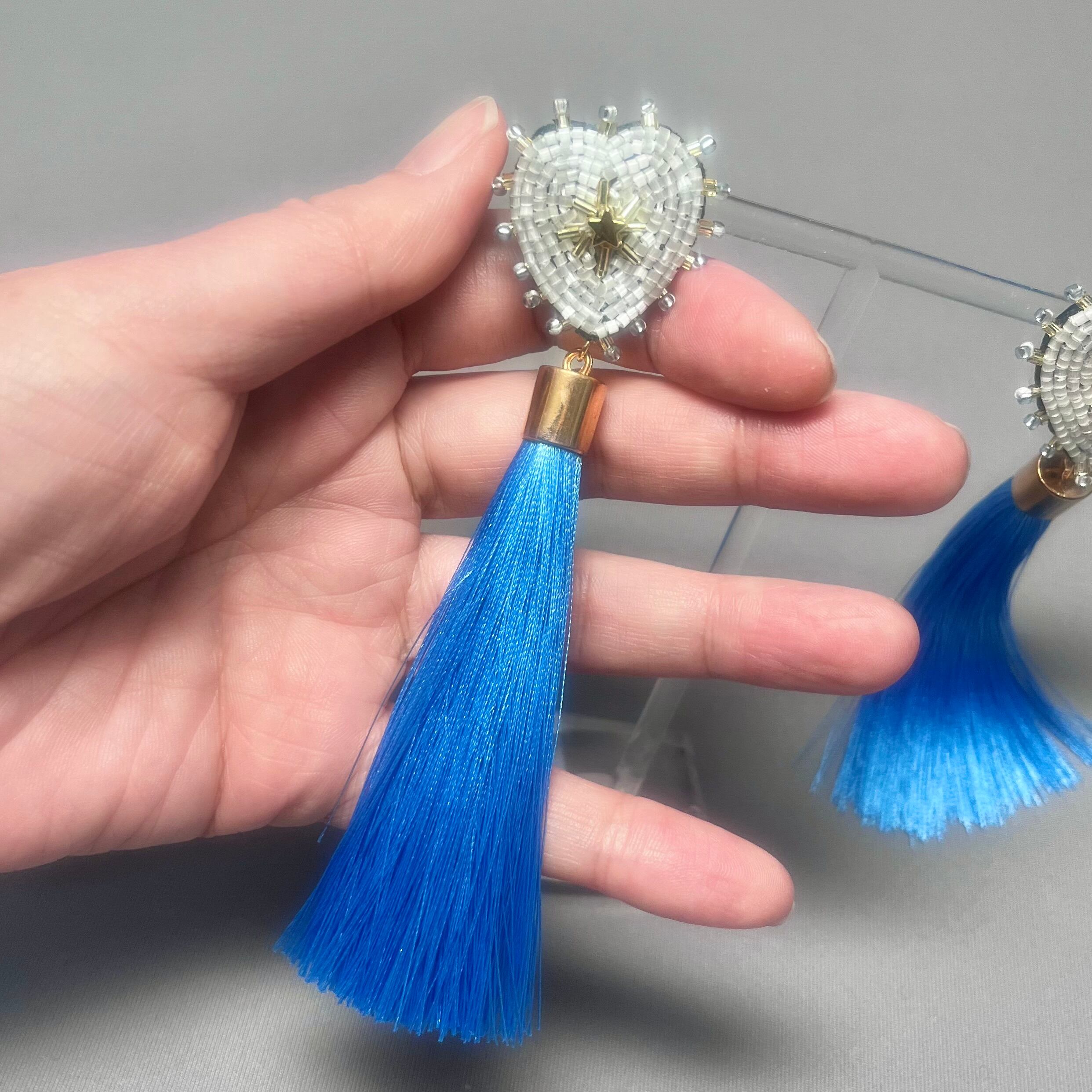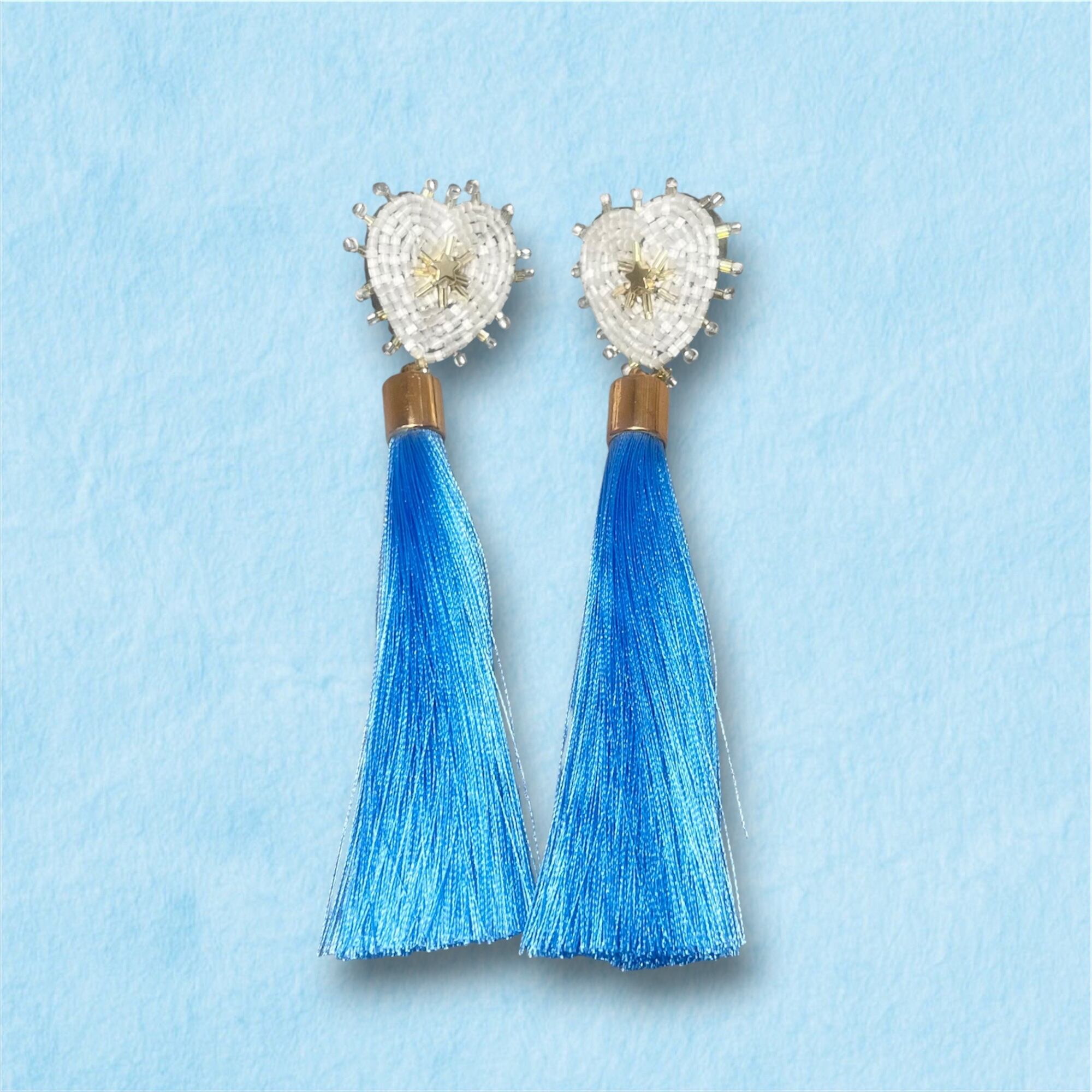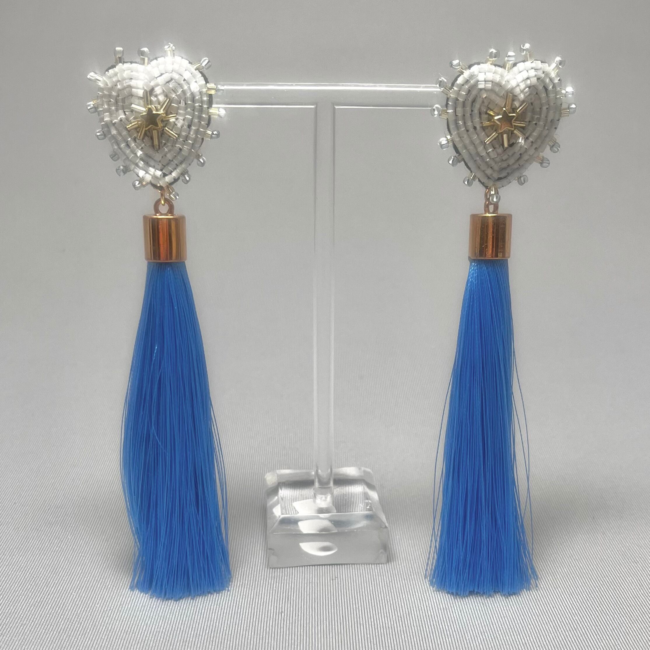 ビーズを使用して丁寧に仕上げられたハート耳飾り。清楚で優しい白色と爽やかなブルーのフリンジが耳元を華やかに彩り、シンプルなスタイルにも特別な魅力をプラスします。日常使いはもちろん、特別なシーンにもぴったりなアイテムです。