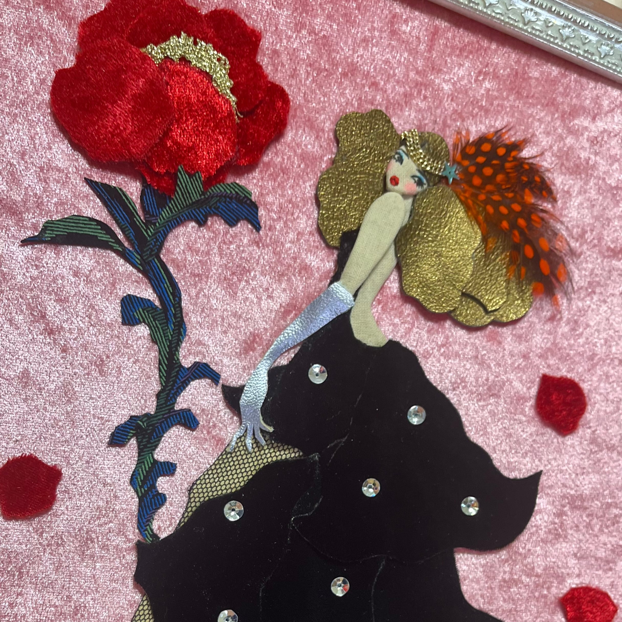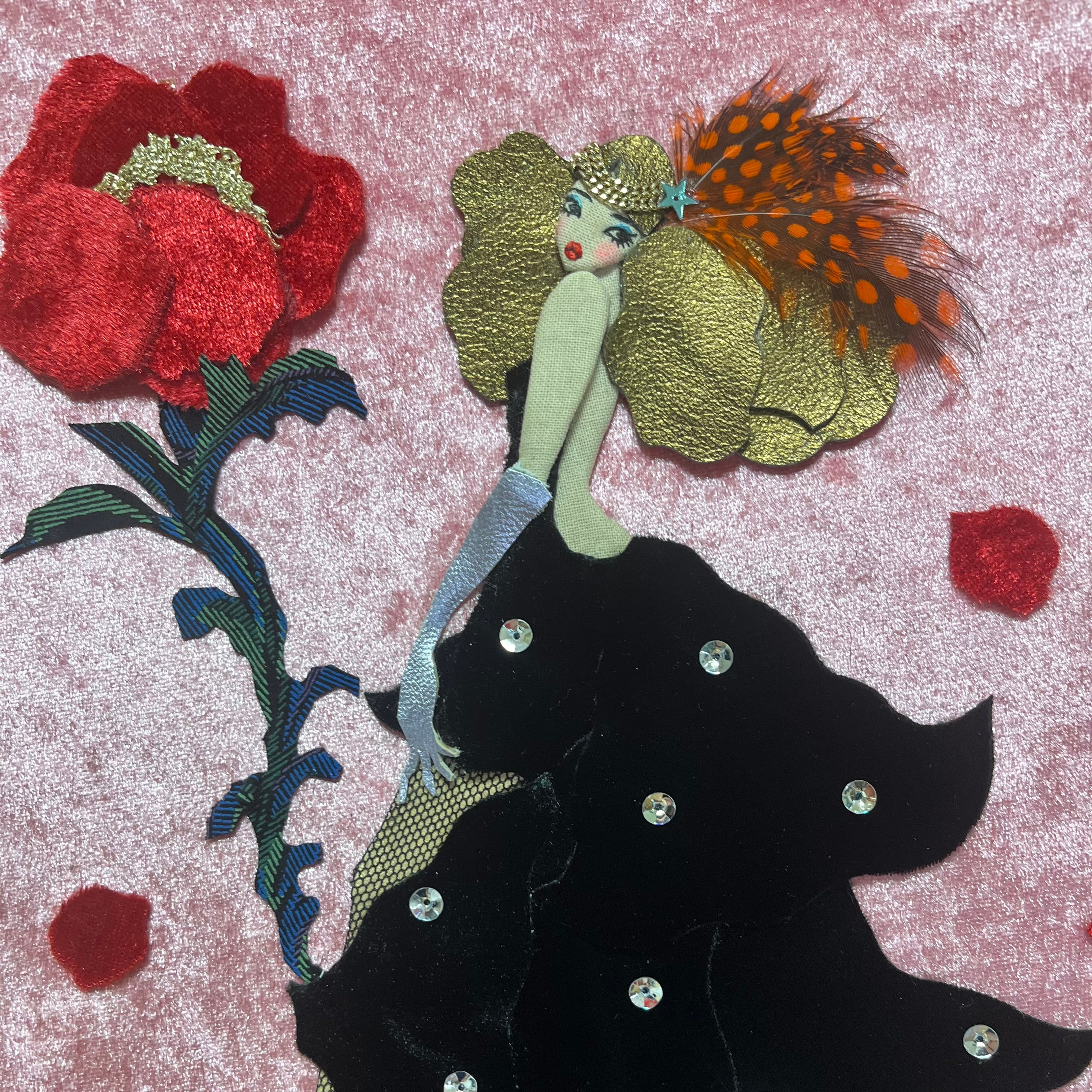 布、様々なクラフトパーツ、刺繍などを組み合わせて仕上げたイラストレーション。