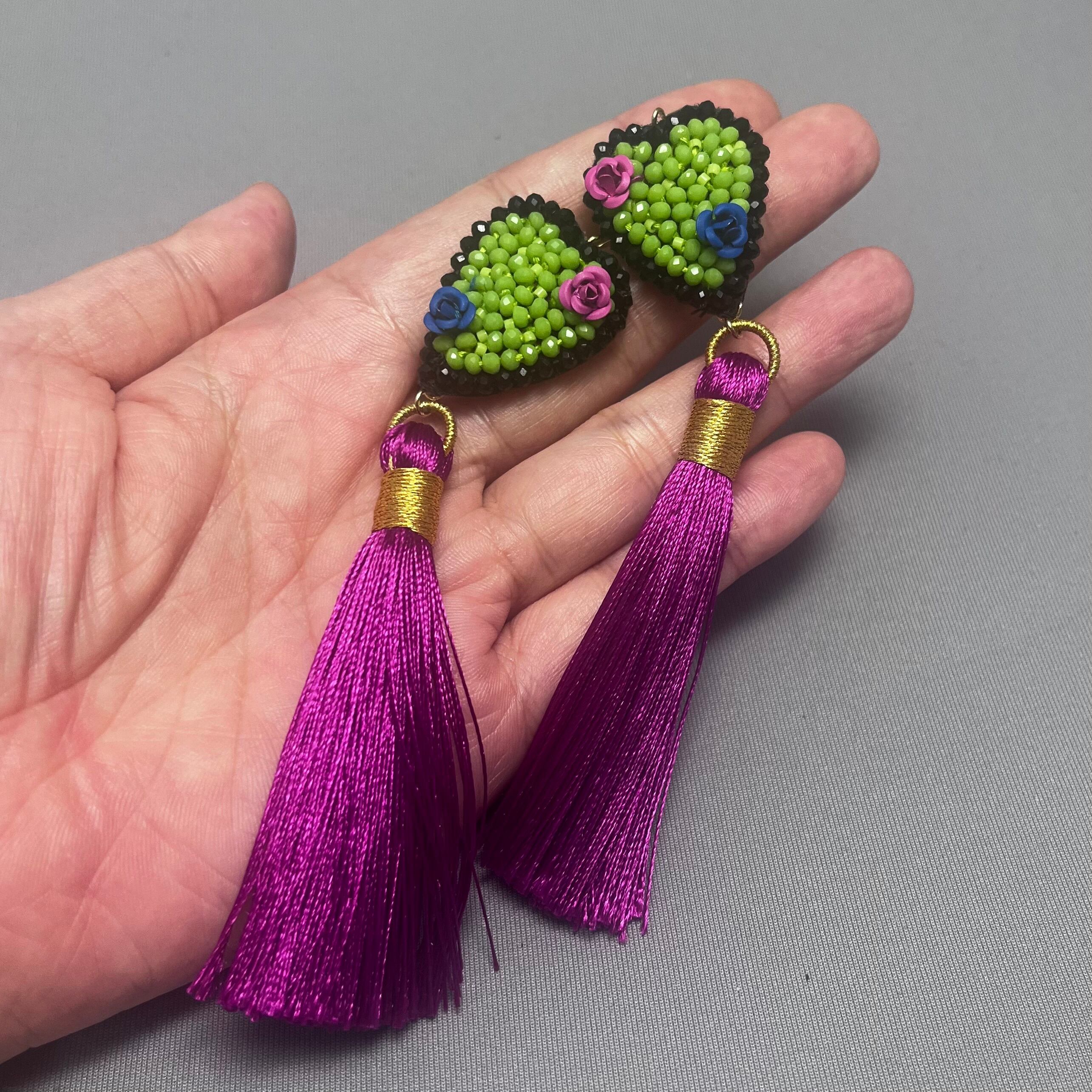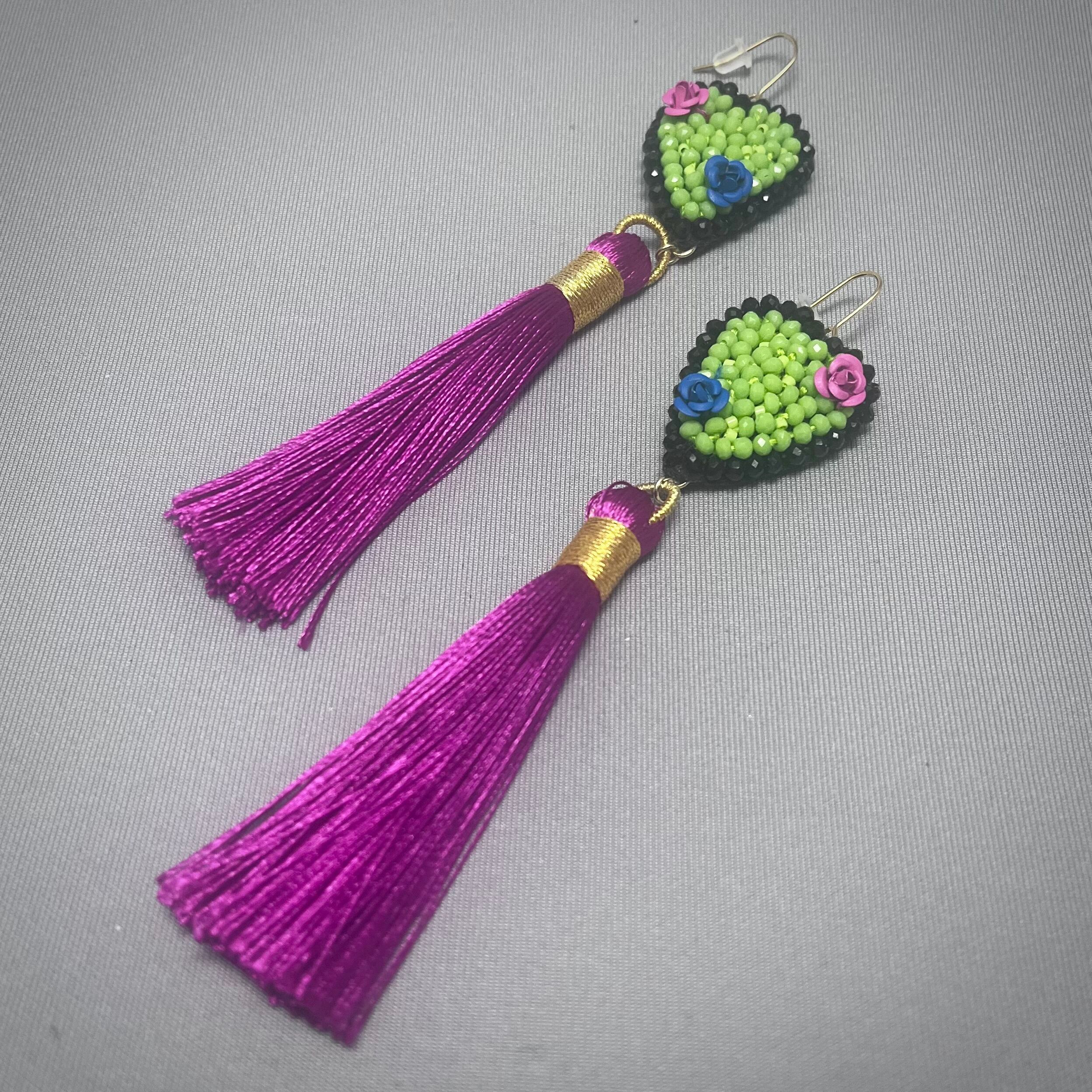 カラフルな色味とタッセルが華やかな印象の耳飾りです。
